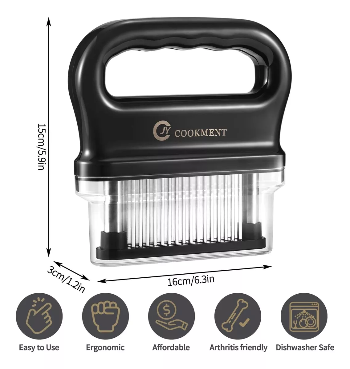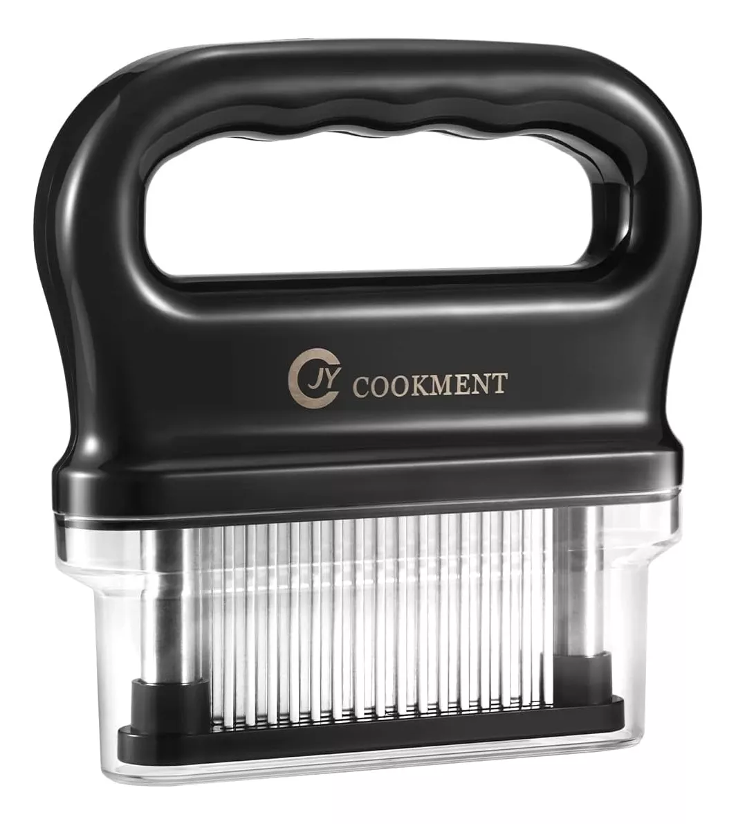 JY COOKMENT ablandador de carne diseño ergonómico con un mango cómodo y antideslizante. Simplemente presiona hacia abajo en la parte superior y las cuchillas afiladas cortan las fibras más duras de tu corte de carne particular.