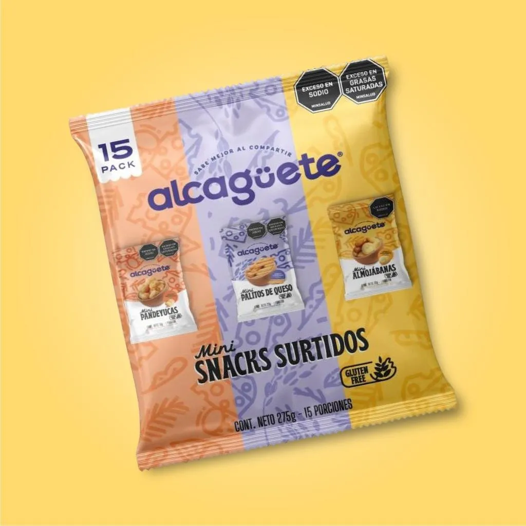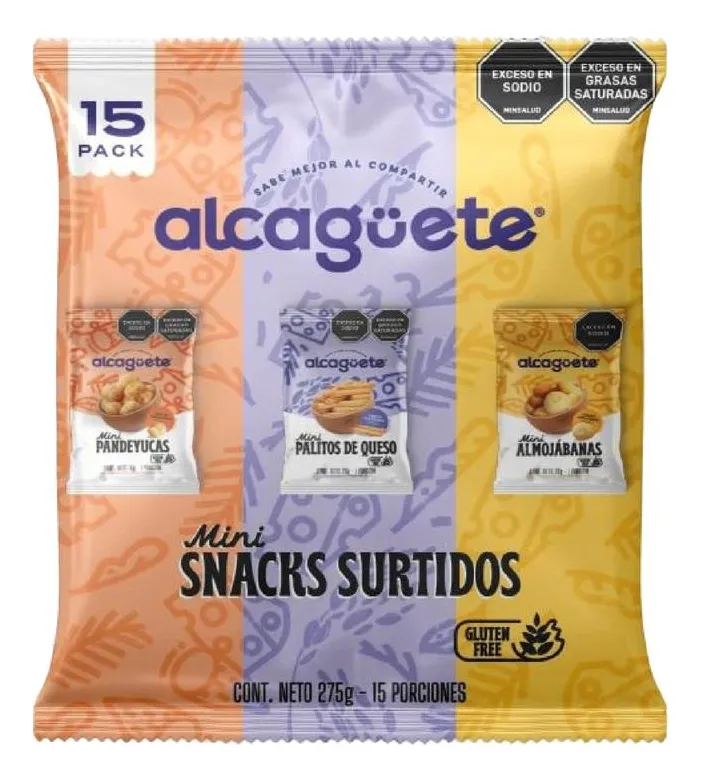 Descripción El trío de mini snacks de Alcagüete es perfecto para disfrutar de una experiencia auténtica, sabrosa y práctica en cada bocado. Este set incluye mini almojábanas, mini pandeyucas y mini palitos de queso, una combinación irresistible de bocados tradicionales que evocan el sabor de la panadería artesanal con el toque moderno de un formato ideal para compartir, llevar o disfrutar en cualquier momento del día. Las mini almojábanas sorprenden con su textura aireada y su sabor ligeramente salado con notas lácteas que se derriten en la boca. Los mini pandeyucas, por su parte, aportan esa miga elástica y el sabor intenso del queso, mientras que los mini palitos de queso ofrecen un balance perfecto entre crocancia y suavidad, convirtiéndose en la opción ideal para quienes buscan un snack sabroso sin complicaciones Ingredientes Premezcla de almojabana (almidón de maíz, almidón de yuca, azúcar, dextrosa, leudadante (Bicarbonato de sodio), Sal), queso fresco (leche fresca, cuajo, sal y estabilizante (cloruro de calcio)), huevo,azucar,sal. Premezcla pan de yuca (almidón de yuca modificado, almidón de maíz), queso fresco (leche fresca, cuajo, sal y estabilizante (cloruro de calcio)), margarina, Colombia huevo. Mezcla de almidones y harinas (Almidón de yuca, harina de arroz) Mezcla de quesos (queso costeño (leche fresca, sal (cloruro de sodio) y cuajo) y queso parmesano), Mantequilla. Información del producto Incluye 5 unidades de Mini Pandeyucas de 15 g, 5 unidades de Mini Almojábanas de 20 g y 5 unidades de Mini Palitos de Queso de 20 g | Libre de Gluten | Estos snacks de Alcagüete son ideales para acompañar un café, servir como pasabocas en reuniones o simplemente disfrutar entre comidas | Almacenar en un lugar fresco y seco | Producto de Colombia. Etiquetas Vegetariano Sin gluten Especificaciones Gusto Salado Sabor Salado Almacenamiento Temperatura ambiente Peso de la unidad (cada uno) 15.0000 g Peso neto 275.0000 g Cantidad de paquetes (recuentos) 15 País de origen Colombia Importado o Nacional Nacional AlérgenosLeche, Huevos, Soya. Puede contenerNueces (por ejemplo: almendras, nueces y pecanas). Marca Alcagüete Garantía del vendedor: 30 días