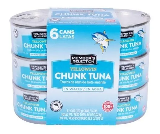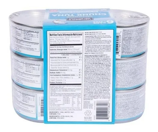 Contiene: 6 latas de trozos de atún de aleta amarilla en agua 170 g (6 oz) por unidad. Peso escurrido 136 g (4,8 oz) por unidad. Protección al delfín.