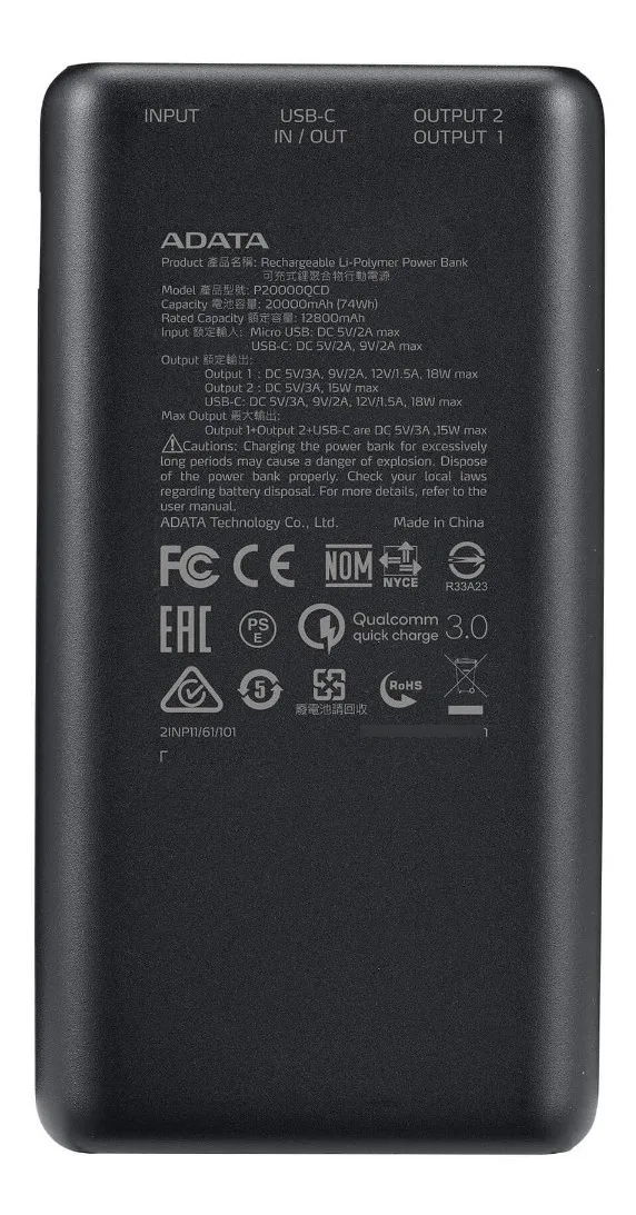 USB-A 1: 5 VCC/3 A, 9 V/2A , 12 V/1,5 A, 18 W máx. USB-A 2: 5 VCC/3 A, 15 W máx. USB-C: 5 VCC/3 A, 9 V/2A , 12 V/1,5 A, 18 W máx. USB-C + USB-A 1+2: 5 VCC/3A, 15W máx.