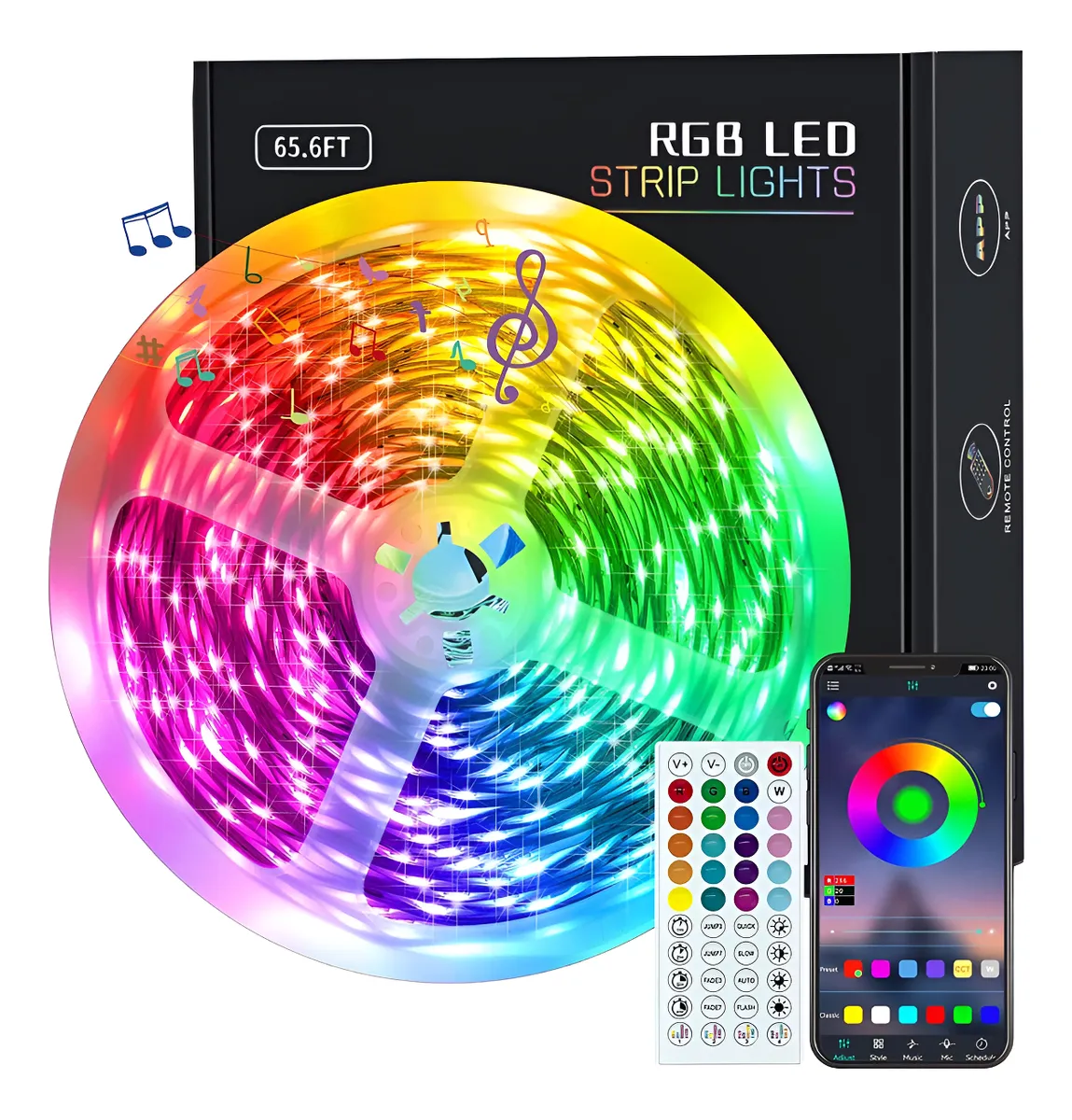 GUSODOR Tira de luces LED de 65.6 pies, luces LED de sincronización de música, luces inteligentes de cuerda que cambian de color, sincronización de 44 teclas, control remoto de aplicación RGB, luces LED de bricolaje para dormitorio, hogar, TV y fiesta (el paquete puede variar)