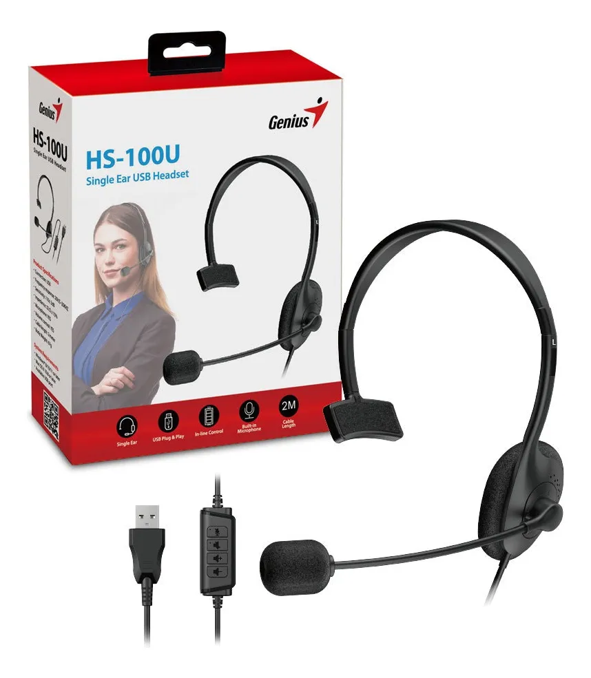 Genius HS-100U Auriculares, un oído, con cable, con micrófono, control de volumen, USB, negro