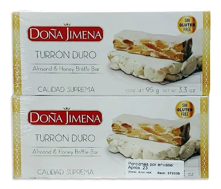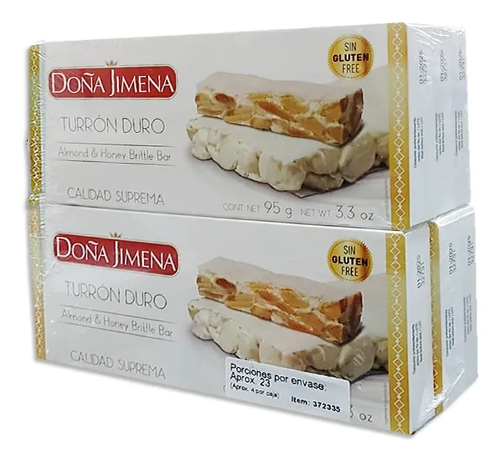 Sumérgete en el sabor tradicional y la calidad suprema del Turrón de Doña Jimena. Este exquisito dulce, elaborado con almendra, miel y clara de huevo, viene en una presentación de 6 unidades de 95 g cada una. Disfruta de su textura crujiente y su suave combinación de ingredientes que se derriten en tu boca. Además, este turrón es sin gluten, lo que lo convierte en una opción perfecta para aquellos con necesidades dietéticas especiales.