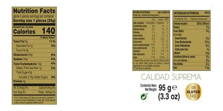 Almendras tostadas (UE y sin UE) (60 %), jarabe de glucosa y fructosa miel (13 %), azúcar, clara de huevo. Oblea de recubrimiento (fécula de patata, aceite de girasol refinado