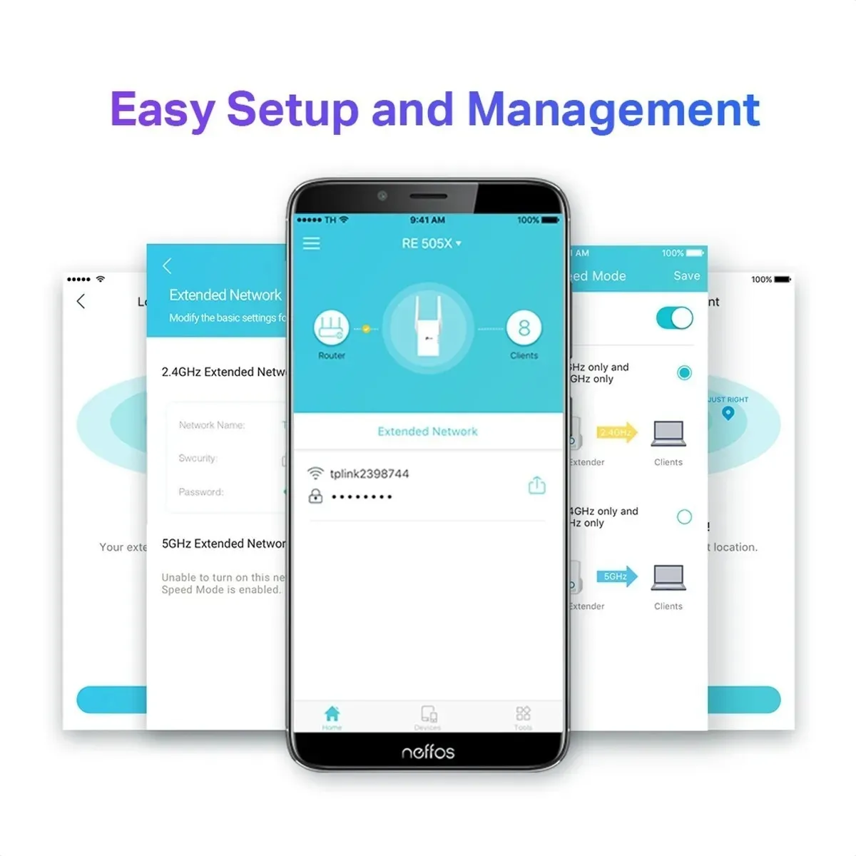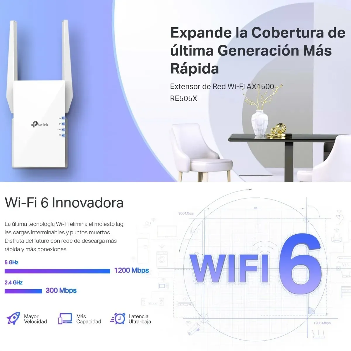 - RE505X viene equipado con la última tecnología inalámbrica, Wi-Fi 6, para velocidades más rápidas, mayor capacidad y congestión de red reducida.