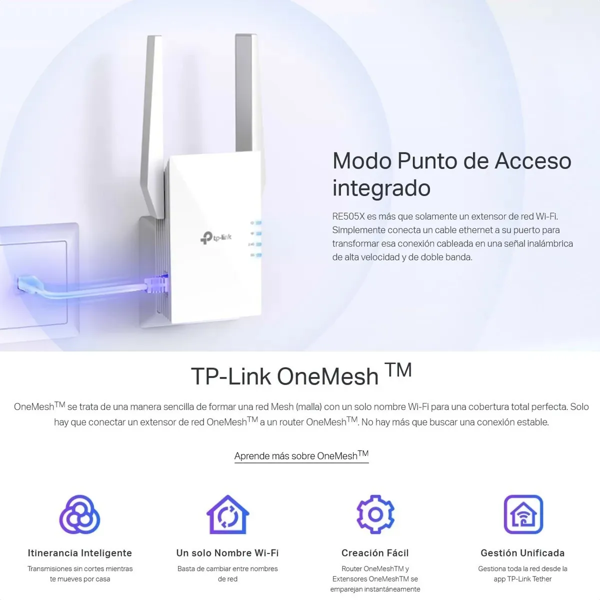 - Crea una red Mesh conectándose a un router TP-Link OneMesh™ para una cobertura perfecta en toda la casa.