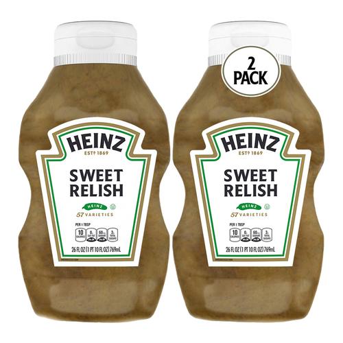 Los pepinos crujientes en escabeche y repollo sumergidos en vinagre de Heinz Sweet Relish te ayudará a crear sabores que complementan cualquier plato. Con trozos de pimiento rojo y extractos de cúrcuma, este dulce condimento agregará una dimensión completamente nueva de sabores a su plato favorito. Este producto se prepara con cuidado para que cada botella tenga la proporción perfecta de ingredientes para complementar tus comidas favoritas. Simplemente exprime esta botella de condimento fresco sobre tu comida o úsala como salsa, el crujido de pepinos y repollo agregará vida a cualquier comida.