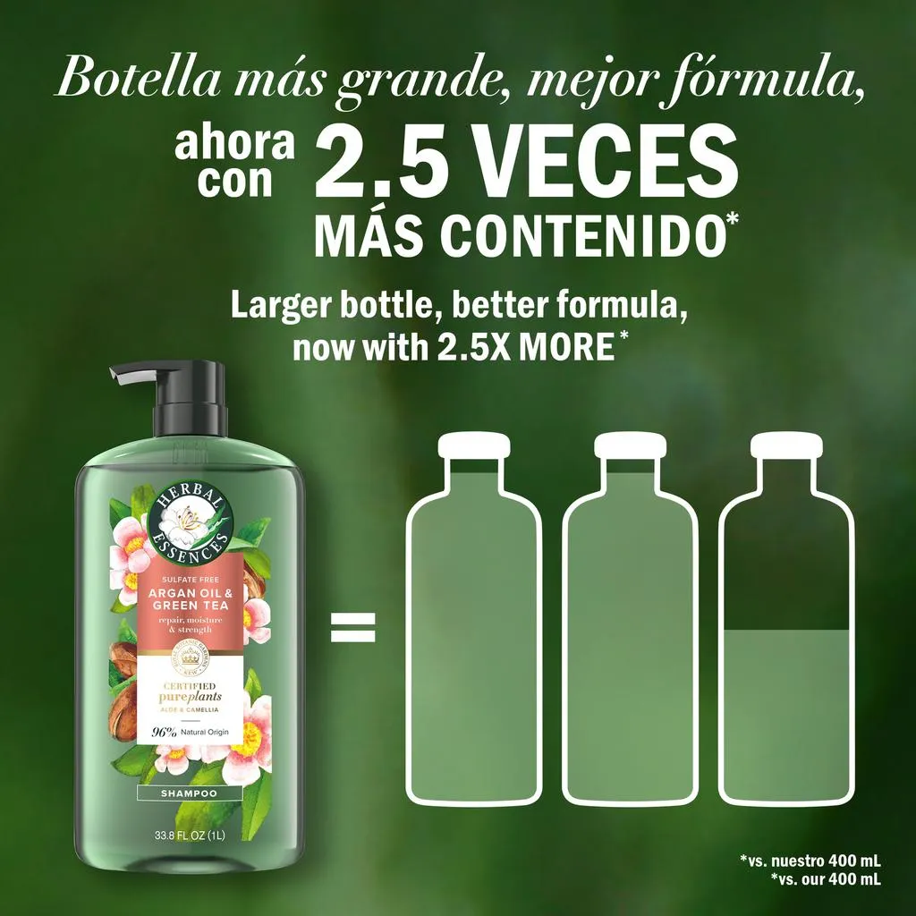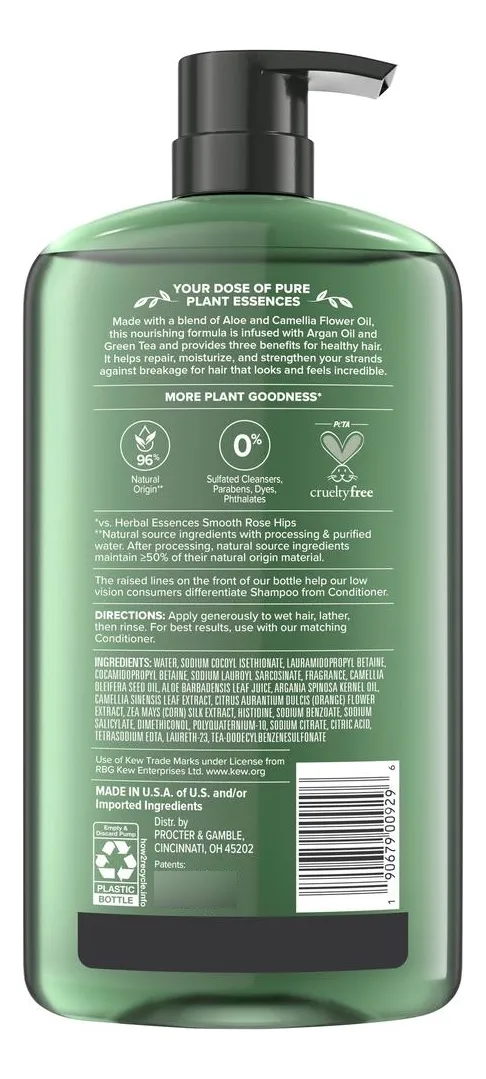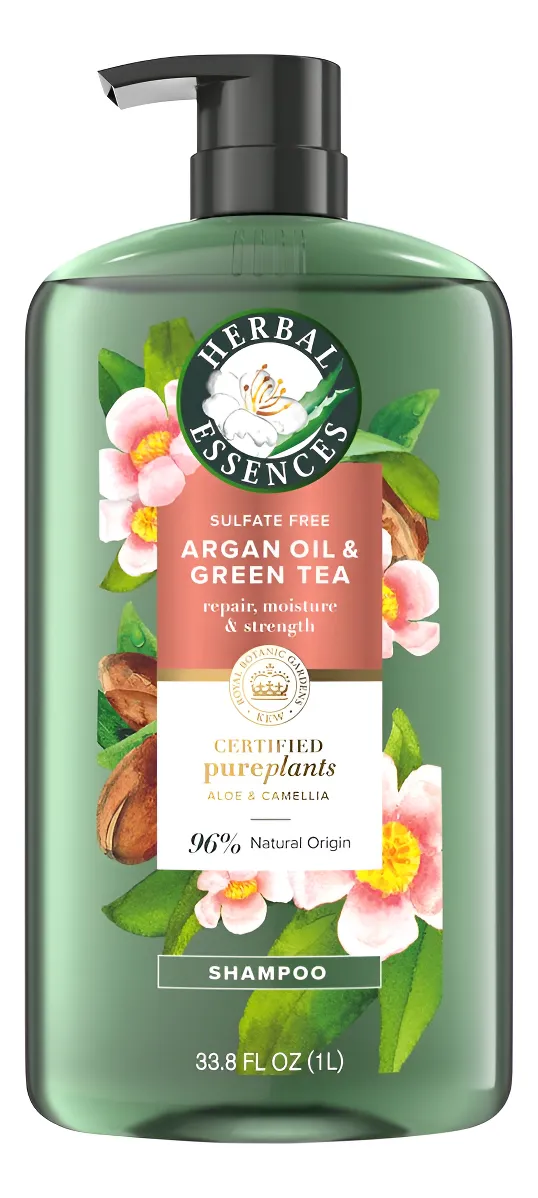 Detalles de producto y especificaciones Descripción Descubre la frescura y el cuidado profundo con el shampoo Herbal Essences, libre de sulfatos, el cual nutre y repara tu cabello gracias a su fórmula enriquecida con aceite de argán certificado, té verde, camelia y aloe vera. Ideal para todo tipo de cabello, ayuda a fortalecer cada hebra mientras hidrata intensamente, dejándolo suave, brillante y lleno de vida. Ingredientes Agua, isetionato de sodio cocoyl, betaína lauramidopropil, betaína cocamidopropil, sarcosinato de lauroil de sodio, fragancia, aceite de semilla de camellia oleifera, jugo de hoja de aloe barbadensis, aceite de semilla de argania spinosa, extracto de hoja de camellia sinensis, extracto de flor de citrus aurantium dulcis (naranja), extracto de seda de zea mays (maíz), histidina, benzoato de sodio, salicilato de sodio, dimeticonol, polyquaternium-10, citrato de sodio, ácido cítrico, edta tetrasódico, laureth-23, tea-dodecilbencenosulfonato Información del producto Shampoo Herbal Essences con Aceite de Argán y Té verde | Presentacion de 1 L / 33.8 oz | Contiene extractos botánicos puros que fortalecen el cabello y reducen la fragilidad | Incluye aceite de camelia certificado y aloe vera para una nutrición intensa y protección contra daños | No testeado en animales | Fragancia única con notas de lavanda, flores y vainilla que brinda una experiencia sensorial agradable | Fabricado en Estados Unidos. Etiquetas Libre de Parabenos Especificaciones Peso neto 1.0000 L Cantidad de paquetes (recuentos) 1 Fragancia Lavanda, flores y vainilla. Tipo de cabelloTodo tipo de cabello Marca Herbal Essences Garantía del vendedor: 30 días