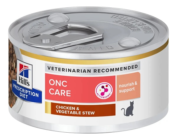 Los nutricionistas y veterinarios de Hill’s desarrollaron la nutrición clínica de Hill’s Prescription Diet ONC Care para ayudar específicamente a nutrir y apoyar a los gatos que luchan contra el cáncer. Esta comida húmeda irresistible con pollo y verduras está diseñada para ser nuestra nutrición con mejor sabor hasta el momento, con grasas sabrosas y proteínas altamente digeribles. Los nutrientes altamente digeribles en Prescription Diet ONC Care son fáciles de absorber para las mascotas y la fórmula también contiene ActivBiome+, una mezcla patentada de fibras prebióticas para respaldar un microbioma gastrointestinal saludable y que ha demostrado proporcionar una calidad de heces constante.