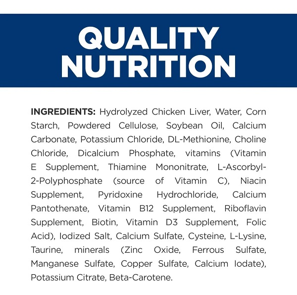Composición y/o Material Hígado de pollo hidrolizado, agua, almidón de maíz, celulosa en polvo, aceite de soya, carbonato de calcio, cloruro de potasio, DL-metionina, cloruro de colina, fosfato dicálcico, vitaminas (complemento de vitamina E, mononitrato de tiamina, L-ascorbil-2-polifosfato (fuente de vitamina C), complemento de niacina, clorhidrato de piridoxina, pantotenato de calcio, complemento de vitamina B12, complemento de riboflavina, biotina, complemento de vitamina D3, ácido fólico), sal yodada, sulfato de calcio, cisteína, L-lisina, taurina, minerales (óxido de zinc, sulfato ferroso, sulfato de manganeso, sulfato de cobre, yodato de calcio), citrato de potasio, beta caroteno.