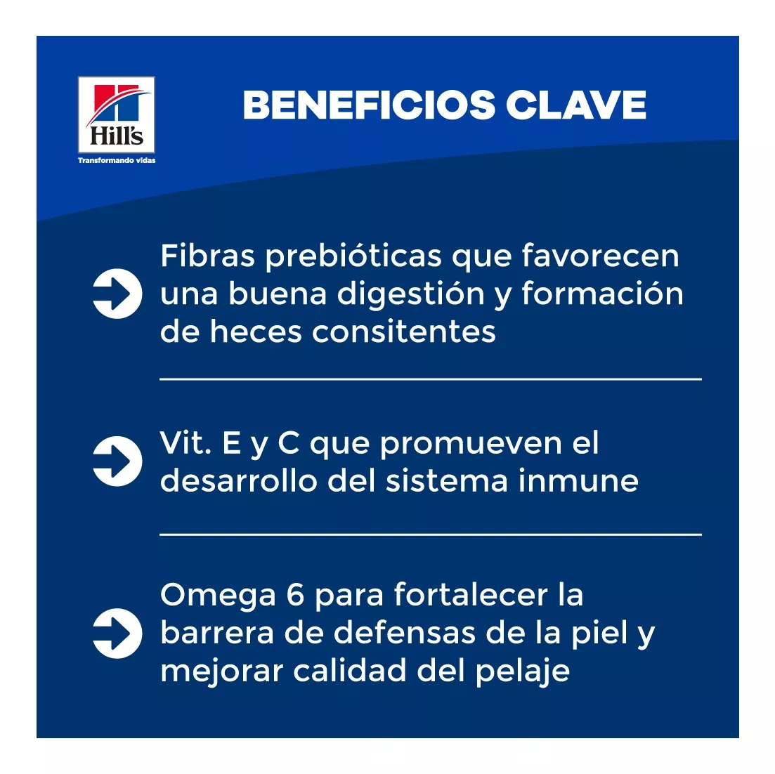 Beneficios 1. Fibras prebióticas que favorecen la digestión y formación de heces consitentes. 2. Vit. E y C que promueven el desarrollo del sistema inmune. 3. Omega 6 para fortalecer la barrera de defensas de la piel y mejorar calidad del pelaje