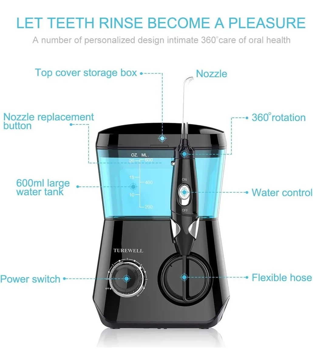 Irrigador bucal con hilo dental de agua, limpiador dental de agua de 600 ml, 10 presiones ajustables, hilo dental eléctrico para dientes/aparatos ortopédicos, 8 puntas de chorro de agua para la familia (Negro)