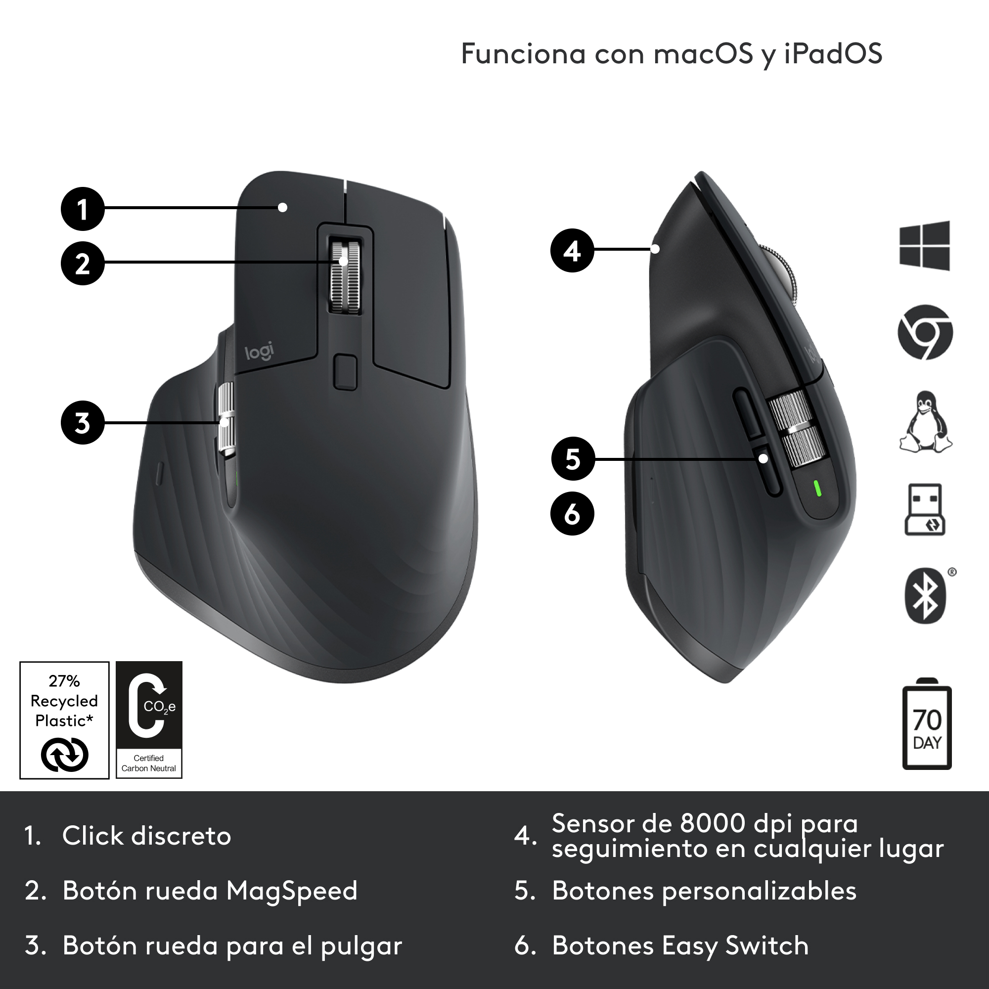 - Compatibilidad con Logi Options+ para Windows y macOS 1Disponible para Windows y macOS en logitech.com/optionsplus