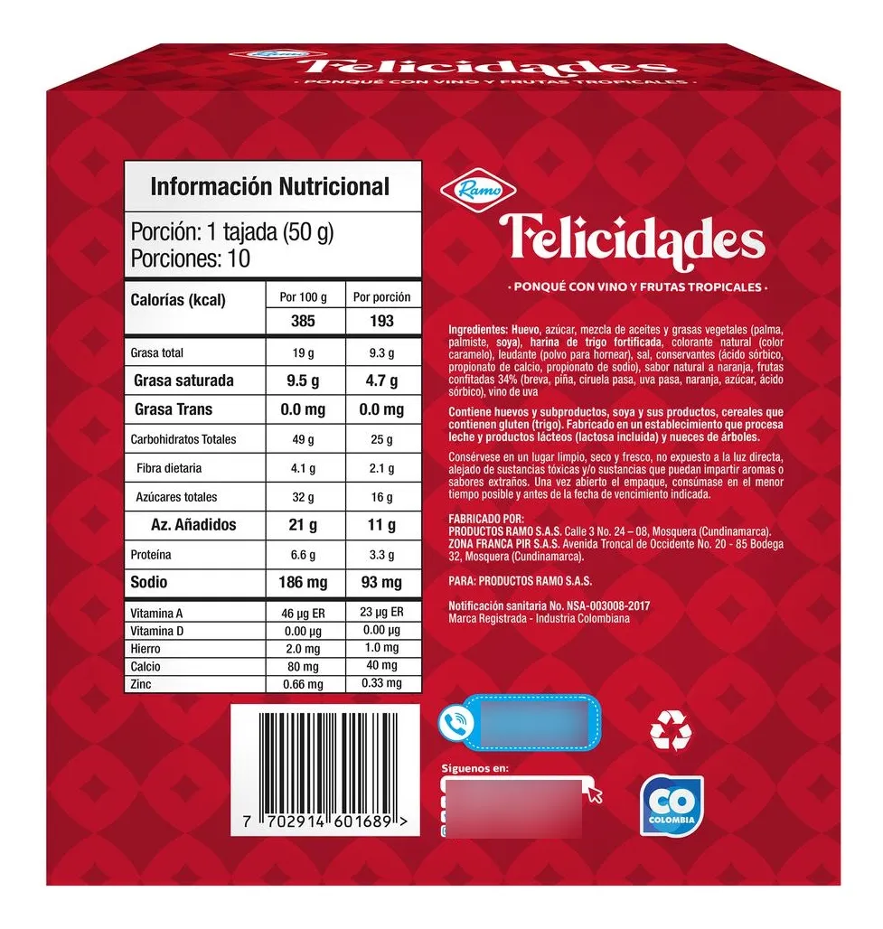 Incluye 1 unidad de ponqué con vino y frutas tropicales de 500 g | Es perfecto para acompañar una taza de café en la tarde, endulzar celebraciones familiares o convertirse en el centro de la mesa durante una ocasión especial | Almacenar en un lugar fresco y seco | Producto de Colombia.