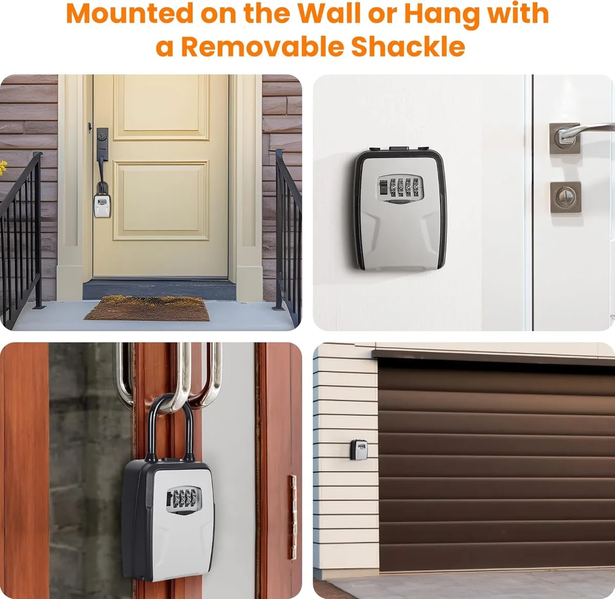 - Fácil de instalar: la caja de bloqueo de llaves viene con un grillete extraíble, proporcionando instalación montada en la pared y colgante. 2 opciones de instalación. Puedes montarlo en la pared de tu departamento u oficina. O puedes colgarlo en el mango de la puerta de tu hogar.