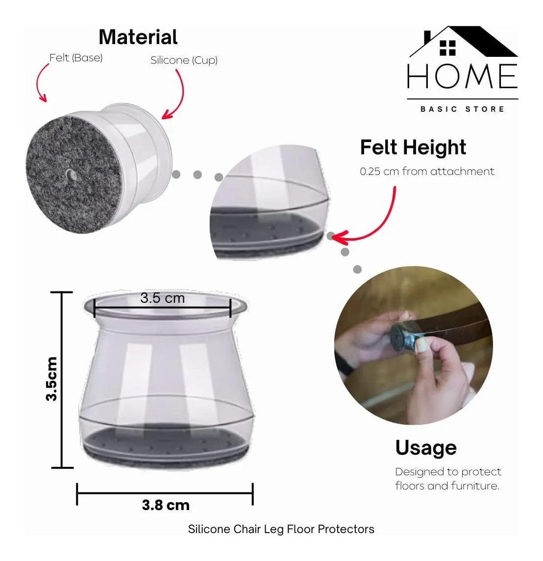 Tamaño común: adecuado para patas de silla con una circunferencia de 3.740-6.299 in. Diámetro circular: 1.260-1.969 in. Longitud cuadrada de 0.945-1.575 in.