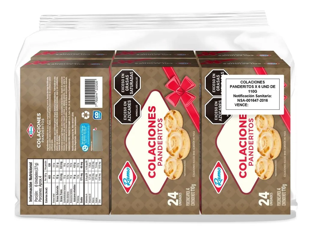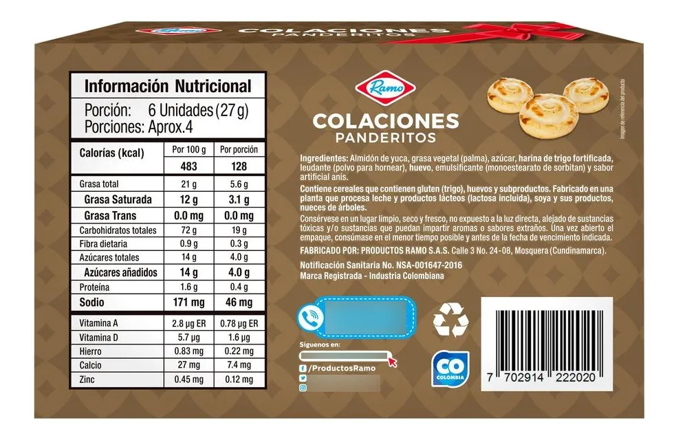 Ingredientes: Almidón de yuca, grasa vegetal (palma), azúcar, harina de trigo fortificada, leudante (polvo para hornear), huevo, emulsificante (monoestearato de sorbitan) y sabor artificial anís. Producido en un establecimiento que utiliza cereales que contienen gluten (trigo), huevos y sus productos derivados, nueces de árboles y sus productos derivados. Contiene leche y productos lácteos (lactosa incluida). Producto de consumo directo.