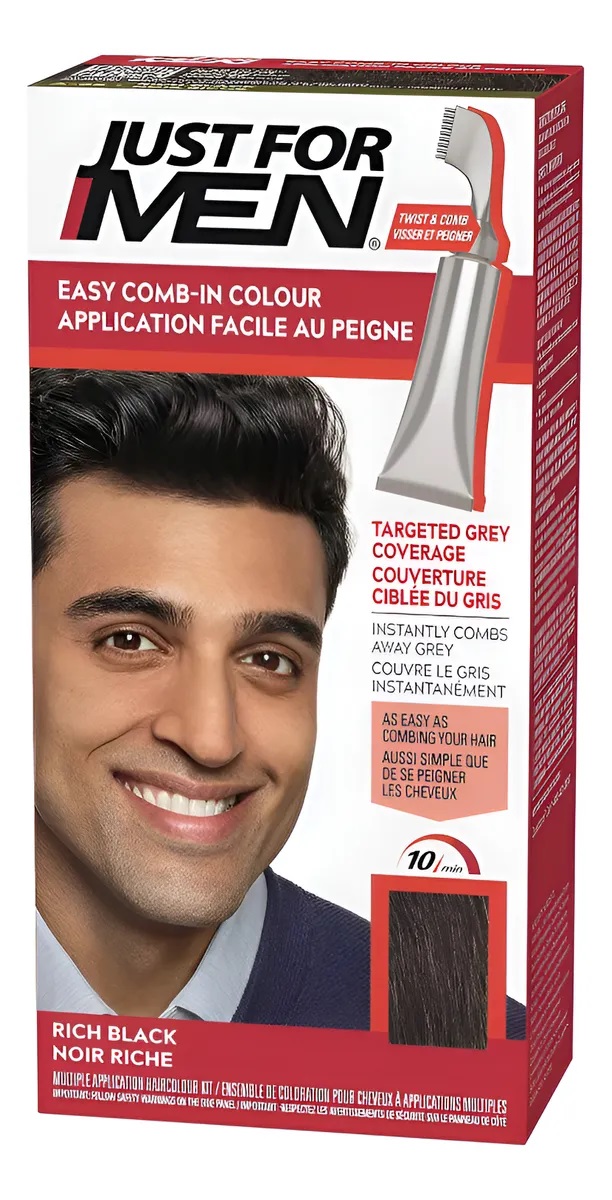 - Nuevo aspecto y nombre, los mismos resultados infalibles; esta fórmula patentada detiene automáticamente la coloración después de 10 minutos, así que no quedará muy oscuro. La coloración de fácil aplicación con peine Just For Men, negro intenso, hace que deshacerte de tu cabello gris sea sencillo.