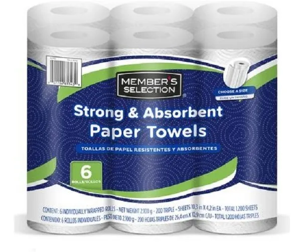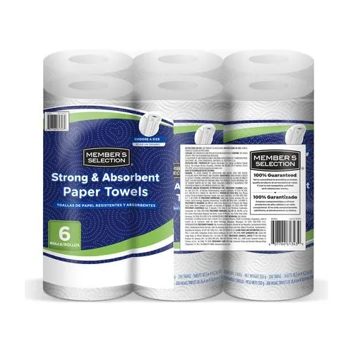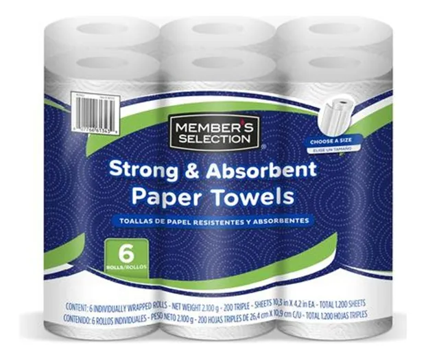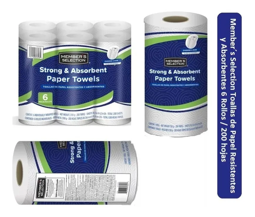 Después de una deliciosa cena las toallas de papel Member’s Selection te ayudaran a dejar tu cocina impecable Después de derramar en la encimera por accidente una bebida, las toallas de papel Member’s Selection te ayudaran a dejar todo limpio; Úsalas siempre que las necesites. Especificaciones: Número de paquete: 6 rollos. | Número de hojas: 200 hojas por rollo. | Numero de capas: 3. | Tamaño de hoja: 11 cm x 26.5 cm (4.3 x 10.4 pulgadas). | Material de fabricación: 10 % pulpa virgen, 90 % pulpa blanqueada reciclada.