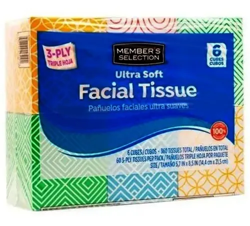 La suavidad suprema con nuestros Pañuelos Faciales Ultra Suaves Member’s Selection, nuestros pañuelos de triple hoja son la solución perfecta para cuidar de tu piel y la de tus seres queridos. Con la contaminación ambiental y la suciedad en aumento, necesitas una forma confiable de mantener tu rostro fresco y limpio. Estos pañuelos no solo son ideales para limpiar tu rostro de manera delicada, sino que también son perfectos para retirar el maquillaje, dejando tu piel radiante y sin residuos. Con un paquete de 6 cubos, cada uno en un color vibrante, tendrás un suministro abundante de 360 pañuelos faciales ultra suaves a tu disposición. 60 Hojas.