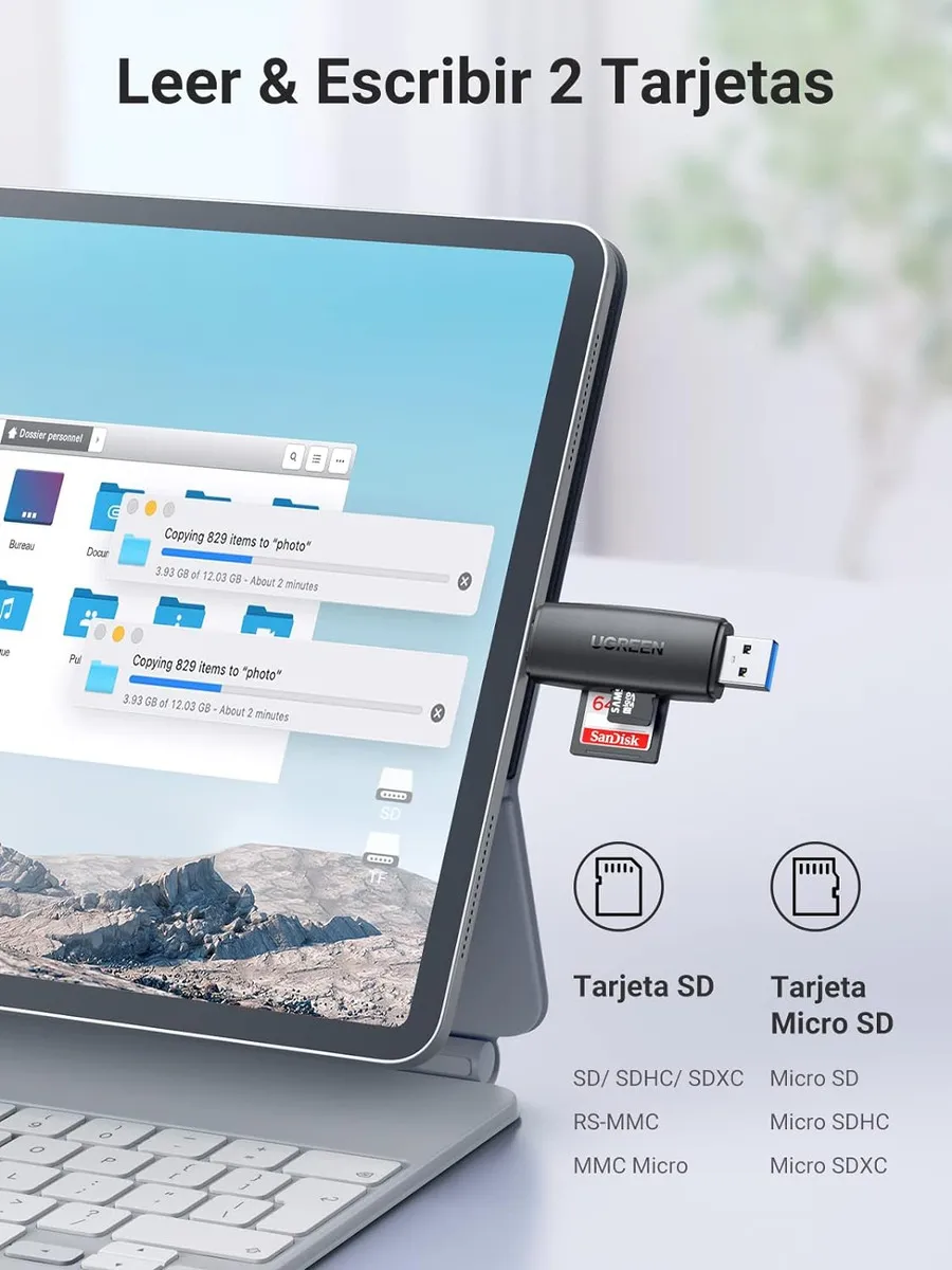 - Tarjeta SD y TF compatible: lectura y escritura simultáneamente en 2 tarjetas de memoria externa (SD/Micro SD) para guardar la conexión y extracción constantes de enchufes. Un método conveniente para transferir archivos/fotos/videos entre las tarjetas SD de la cámara digital y los teléfonos o entre tarjetas de memoria duales, sin necesidad de ocupar espacio en los dispositivos.