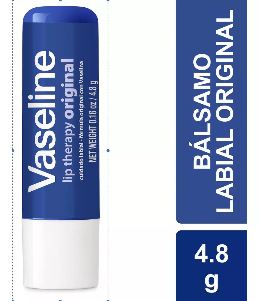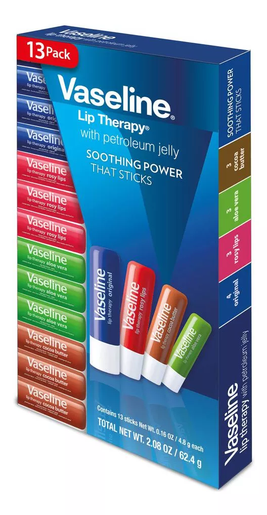 Este producto está hecho con Vaseline Jelly, que brinda humectación esencial a los labios, manteniendo la humedad, dándoles una apariencia saludable y una sensación suave. Especialmente diseñado para los labios con una fórmula personalizada y empaquetado en una práctica barra de bálsamo labial; la barra Original protege y alivia los labios resecos, la barra Rosy Lips contiene almendras dulces y aceite de rosas que le dan a los labios resecos humectación y alivio, la barra de manteca de cacao alivia los labios secos y opacos dejándolos con una sensación más suave, y la barra de aloe vera protege y calma los labios.