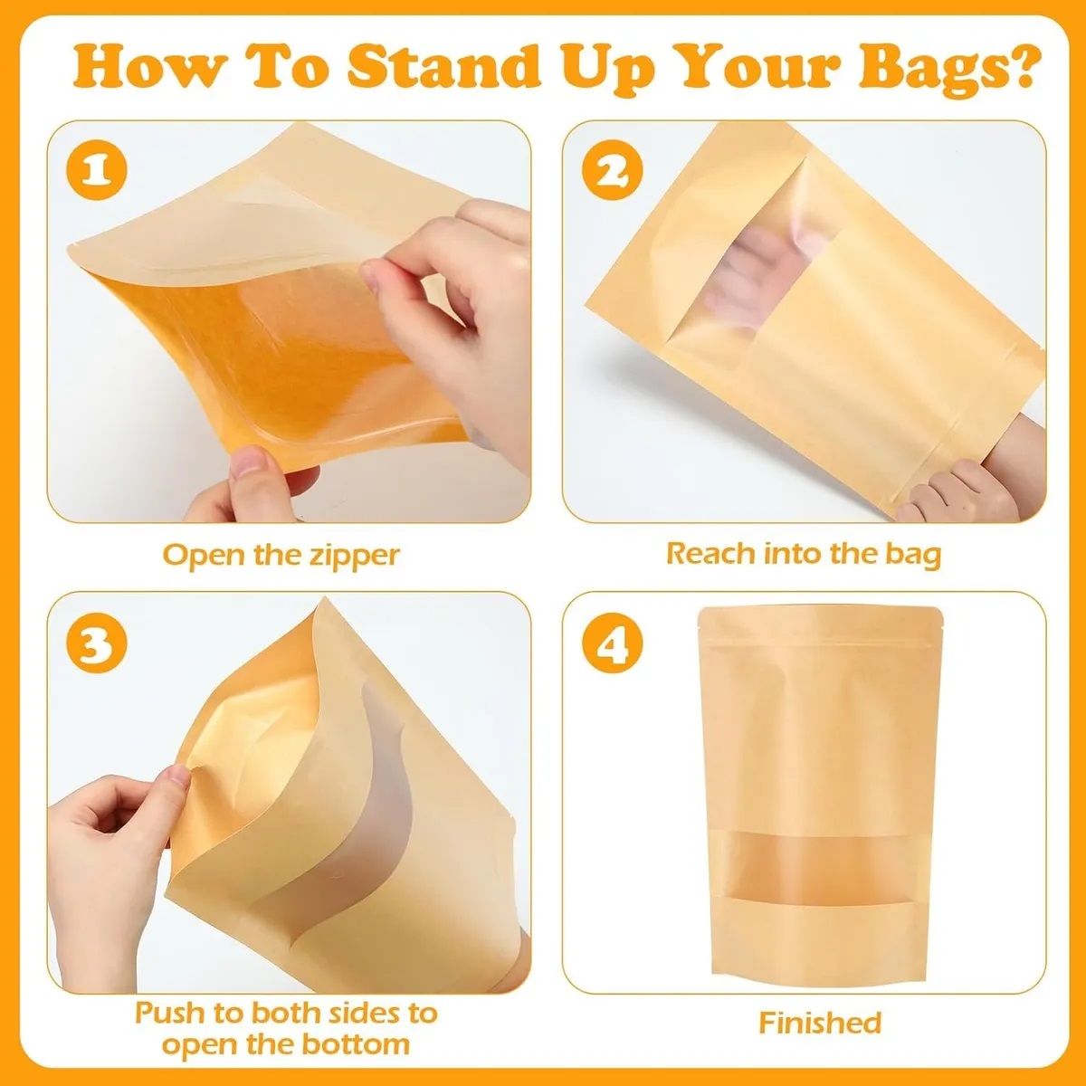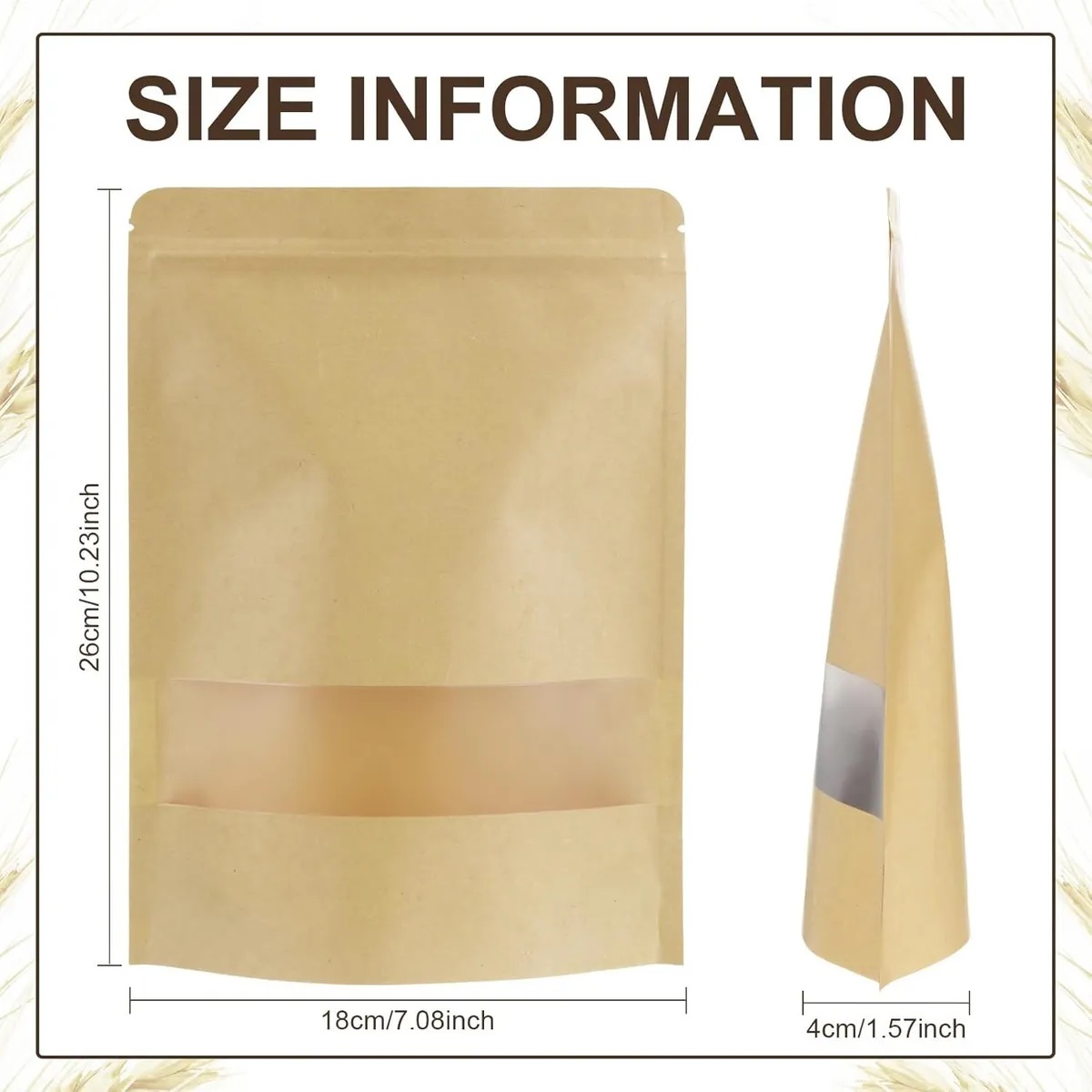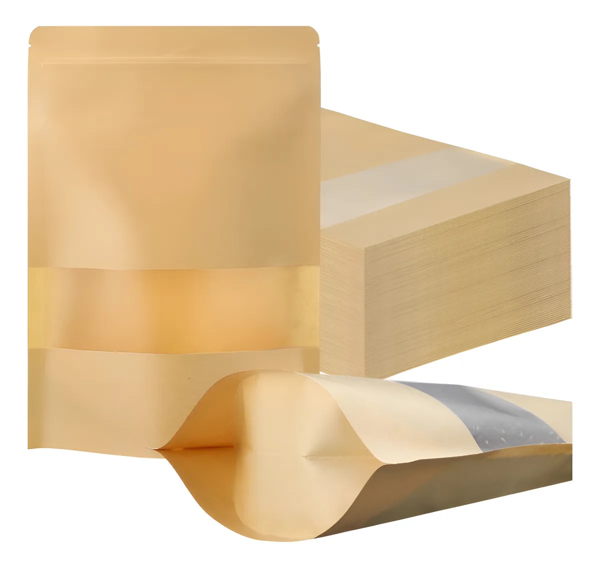Essentials Insumos y Empaques50 Bolsas Kraft Doy Pack Zipper Ventana (20x30cm) 1 Kg Dorado Oscuro Liso