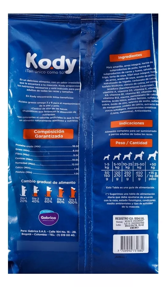 Composición y/o Material Maíz amarillo y/o arroz integral, harina de subproductos de pollo y/o harina de subproductos de carne y hueso, salvado de trigo, torta de soya y/o fríjol soya integral, harina de arroz, grasa vegetal y/o grasa animal, carbonato de calcio, fosfato bicálcico y/o tricálcico, sal común, levadura (Saccharomyces Cerevisiae), vitamina A, vitamina D3, vitamina E, vitamina K3, vitamina B1, vitamina B2, vitamina B6, vitamina B12, niacina, pantotenato de calcio, biotina, ácido fólico, colina, sulfato ferroso, sulfato de cobre, óxido de zinc, selenito de sodio, sulfato de manganeso, yodato de calcio, Extracto de yucca schidigera. Aminoácidos sintéticos (Lisina, metionina), Antioxidante (B.H.T).