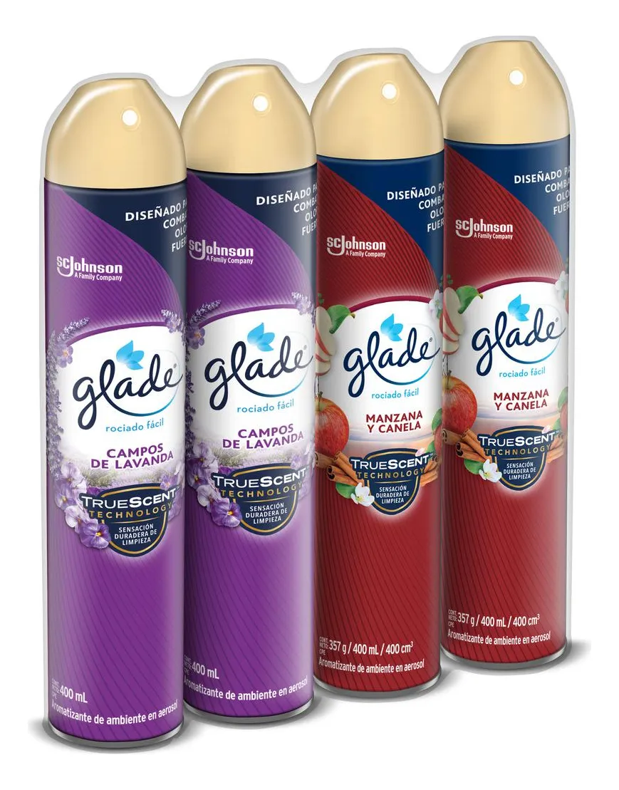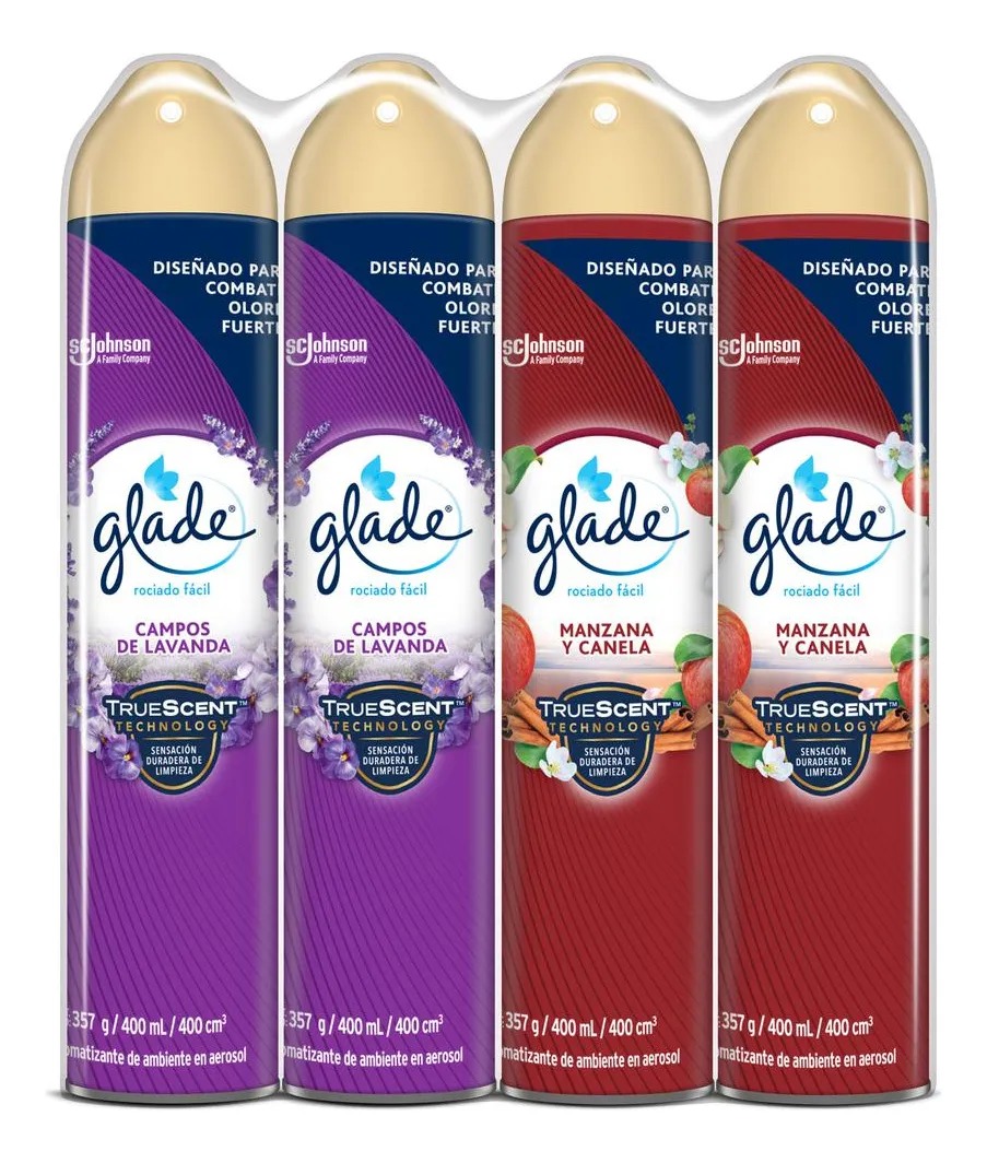 Gracias a su fórmula avanzada, Glade no solo enmascara los olores, sino que los elimina de manera efectiva, dejando un ambiente fresco y agradable en todo momento | Contiene 4 unidades de Glade con 400 mililitros cada uno | 2 unidades son fragancia a manzana y canela | 2 unidades de lavanda | Ambientador en aerosol | País de origen Colombia.