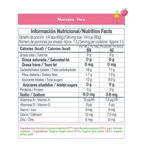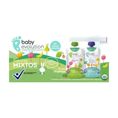 6 Compotas Manzana-Pera. 6 Banano-Durazno-Mango. Sin Azúcar Añadida. Fruta 100% Orgánica. Libre de Almidón. /Libre de conservantes artificiales. Libre de agua añadida. Contenido: 99 g/3.5 oz.