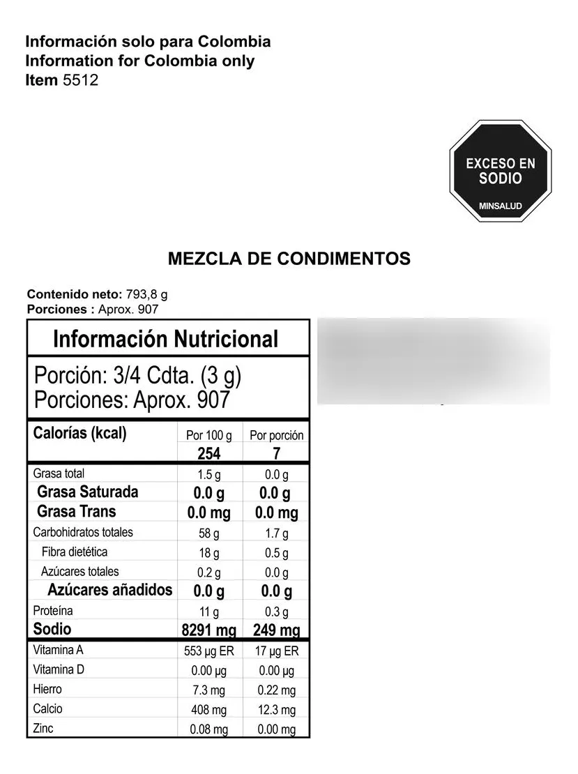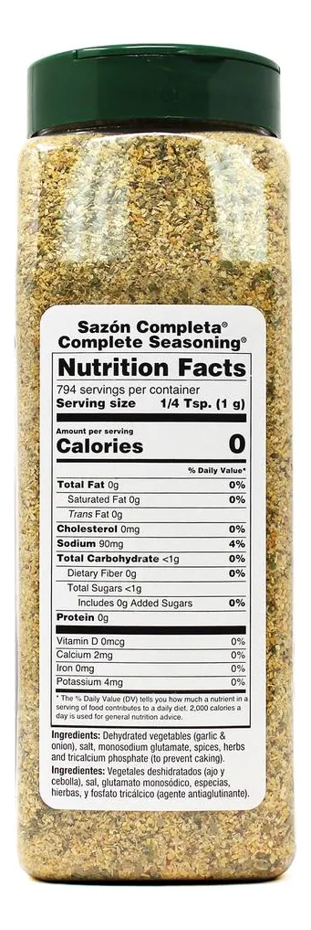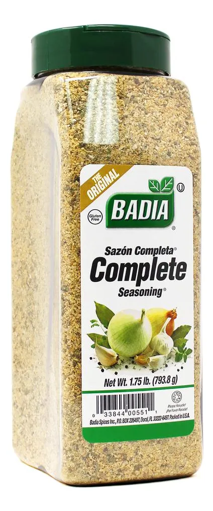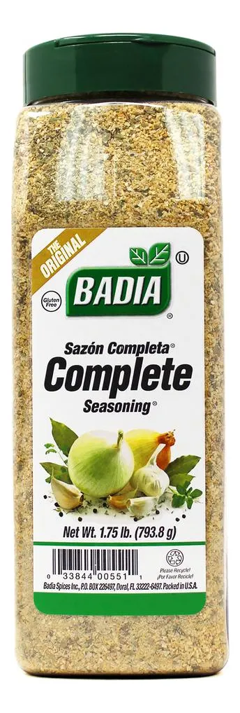 Badia Sazonador Completo – Combinación de Hierbas y Especias 793.8 g / 1.75 lb Descripción Este sazonador completo de Badia es la combinación perfecta de hierbas y especias. La combinación de hierbas y especias con ajo y cebolla como principales ingredientes lo convierte en el adobo ideal para todo tipo de preparaciones de carnes, aves, pescados, sopas, ensaladas, salsas y vegetales. Agrégalo a tus recetas antes, durante o después, y disfruta de su inigualable sabor. Ingredientes Vegetales Deshidratados (Ajo Y Cebolla), Sal, Glutamato Monosódico, Especias, Hierbas, Y Fosfato Tricálcico (Agente Antiaglutinante). Información del producto Este sazonador es todo lo que necesitas para condimentar tus alimentos | Producto Kosher | No contiene gluten | Contiene Glutamato monosódico | Ingredientes principales: ajo y cebolla | Listo para consumir | Almacenar en un lugar seco y fresco. Etiquetas Vegano Kosher Vegetariano Sin gluten Libre de lactosa Especificaciones Forma Granulado Almacenamiento Temperatura ambiente Tipo de especia Adobo País de origen Estados Unidos Importado o Nacional Importado AlérgenosNo contiene ninguno de los alérgenos principales. Cantidad de paquetes (recuentos) 1 Tamaño de la unidad (cada uno) 793.8000 g Peso neto 793.8000 g Marca Badia Garantía del vendedor: 30 días