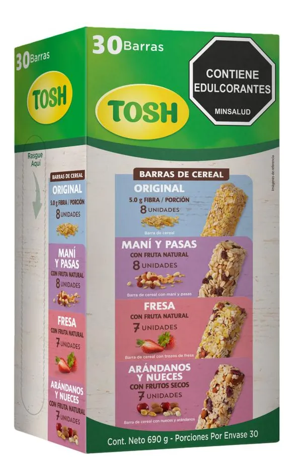 Detalles de producto y especificaciones Descripción Descubre el equilibrio perfecto entre sabor y bienestar con las barras de cereal Tosh en sabores surtidos en su práctica presentación de 30 unidades de 23 g. Incluye 8 barras sabor Original, 8 de Maní y Pasas, 7 de Fresas y 7 de Arándanos con Nueces. Son ideales para quienes buscan una opción saludable, con ingredientes seleccionados que aportan energía y saciedad de forma deliciosa. Ingredientes *Original: hojuela de maíz (maíz, sal y emulsionante), hojuelas de avena, incrementador de volumen (polidextrosa e isomalt), leche descremada en polvo, aceite de maíz, grasa vegetal, lactilato de sodio, bicarbonato de sodio, glucósidos de esteviol de estevia y antioxidante natural. *Fresa: hojuela de maíz (maíz, sal y emulsionante), hojuelas de avena, incrementador de volumen (polidextrosa e isomalt), leche descremada en polvo, fresa deshidratada, aceite de maíz, grasa vegetal, sabor natural a fresa, lactilato de sodio, bicarbonato de sodio, glucósidos de esteviol de estevia y antioxidante natural. *Arándanos: maní, arándanos, almendra, hojuela de trigo, arroz extruido, incrementador de volumen (polidextrosa e isomalt), leche descremada en polvo, miel de abejas, aceite de maíz, grasa vegetal, lactilato de sodio, ácido cítrico, bicarbonato de sodio, glucósidos de esteviol de estevia y antioxidante natural. *Maní y pasas: maní, avena en hojuela, pasas, arroz extruido, aceite vegetal y antioxidante, incrementador de volumen (polidextrosa e isomalt), leche descremada en polvo, miel de abejas, aceite de maíz, grasa vegetal, lactilato de sodio, cocoa, bicarbonato de sodio, glucósidos de esteviol de estevia y antioxidante natural. Información del producto Fáciles de llevar contigo, son perfectas para calmar el hambre a media mañana, disfrutar como merienda rápida o acompañarte en tu rutina diaria sin dejar de cuidarte pero siempre brindándote un sabor exquisito. País de origen Colombia. Especificaciones Gusto Dulce Almacenamiento Temperatura ambiente Peso de la unidad (cada uno) 23.0000 g Peso neto 690.0000 g Cantidad de paquetes (recuentos) 1 País de origen Colombia Importado o Nacional Nacional AlérgenosGluten Maní Leche Nueces (por ejemplo: almendras, nueces, pecanas) Soya Trigo Marca Tosh Garantía del vendedor: 30 días