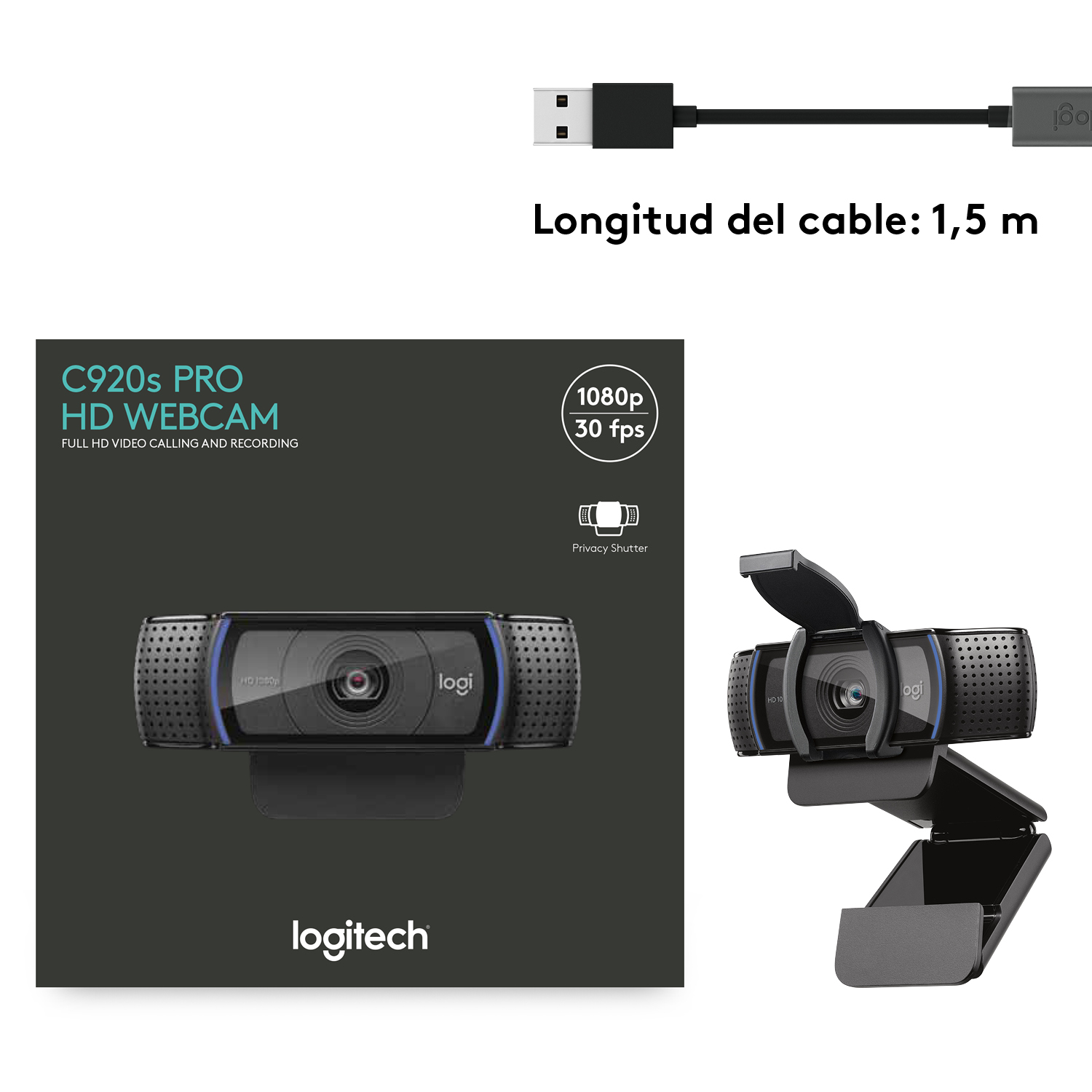 - Cámara web con cable USB-A fijo de 1,5 m