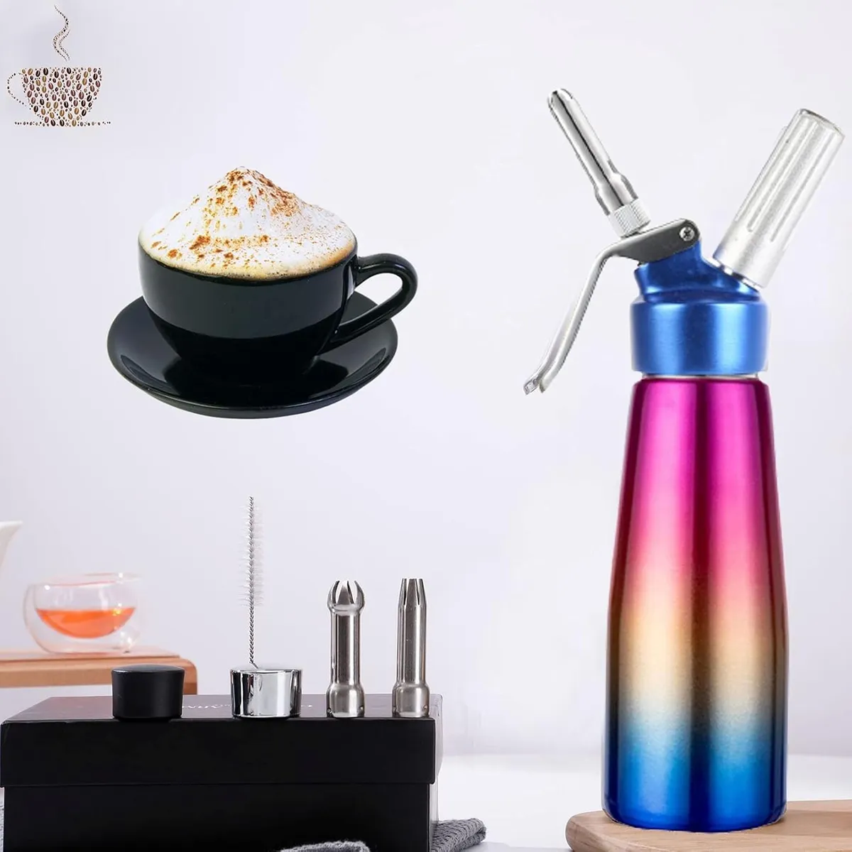 - Múltiples usos y ocasiones prácticas. Sorprende a tu familia, amigos o clientes con deliciosas mousses, coberturas y golosinas en un instante con nuestro batidor de crema. Los cocineros caseros y chefs profesionales pueden completar helados o hacer ricas mousses de chocolate y sabrosas, crema batida de coco, sopas, salsas, espumas, lattes espumados y café nitro.