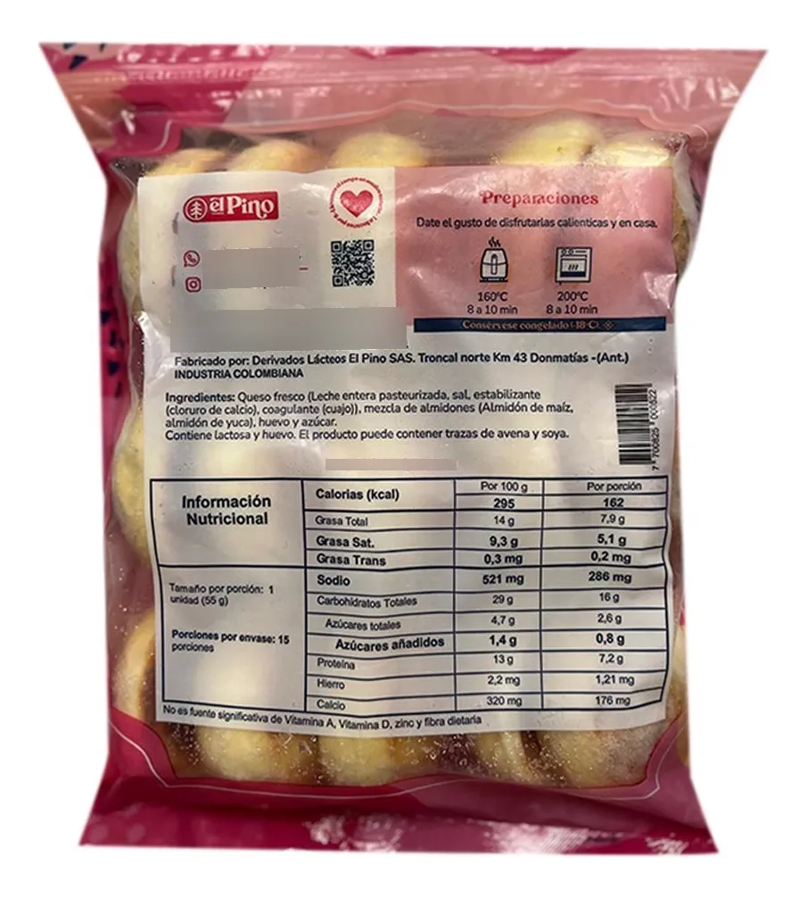 Queso fresco graso duro (Leche entera pasteurizada, sal, estabilizante (Cloruro de Calcio) y coagulante (cuajo)); mezcla de almidones (almidón de maíz, almidón de yuca), azucar y huevo.