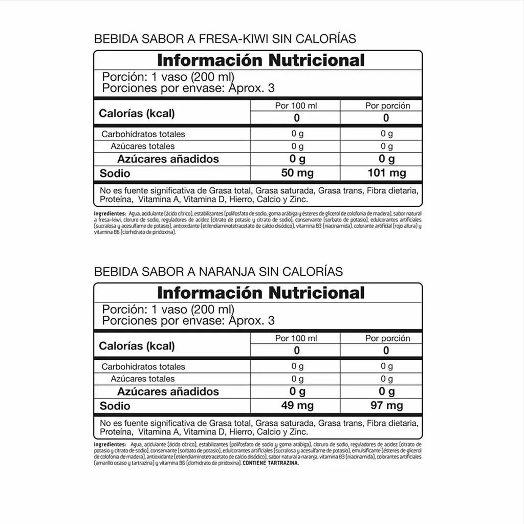 Sabor fresa kiwi: Agua, acidulante (ácido cítrico), sales (cloruro de sodio, citrato de potasio y citrato de sodio), estabilizantes (polifosfato de sodio, goma arábiga y ésteres de glicerol de colofonia de madera), sabor natural a fresa-kiwi, conservante (sorbato de potasio), edulcorantes artificiales (sucralosa y acesulfame de potasio), antioxidante (EDTA de calcio disódico), vitaminaB3 (niacinamida), colorante artificial (rojo allura) y vitamina B6 (clorhidrato de piridoxina).