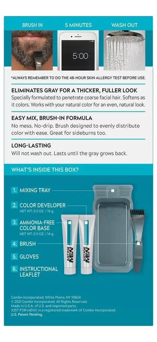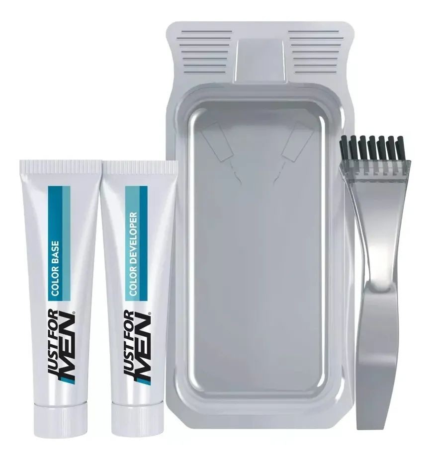 - Nuevo aspecto y nombre, los mismos resultados infalibles; esta fórmula patentada detiene automáticamente la coloración después de 10 minutos, así que no quedará muy oscuro. La coloración de fácil aplicación con peine Just For Men, negro azabache, hace que deshacerte de tu cabello gris sea sencillo.