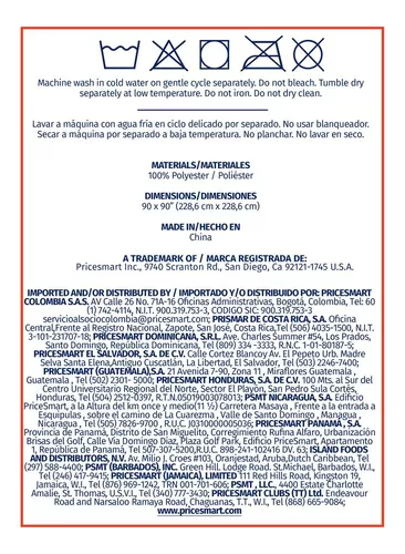 Está elaborada en 100% poliéster. Podrás elegir entre colores variados. Sus dimensiones para cama tamaño queen son 228 cm x 228 cm. Teñido con la técnica de tintura para la conservación del agua “Aqua Smart Dye”. Fabricada en China.