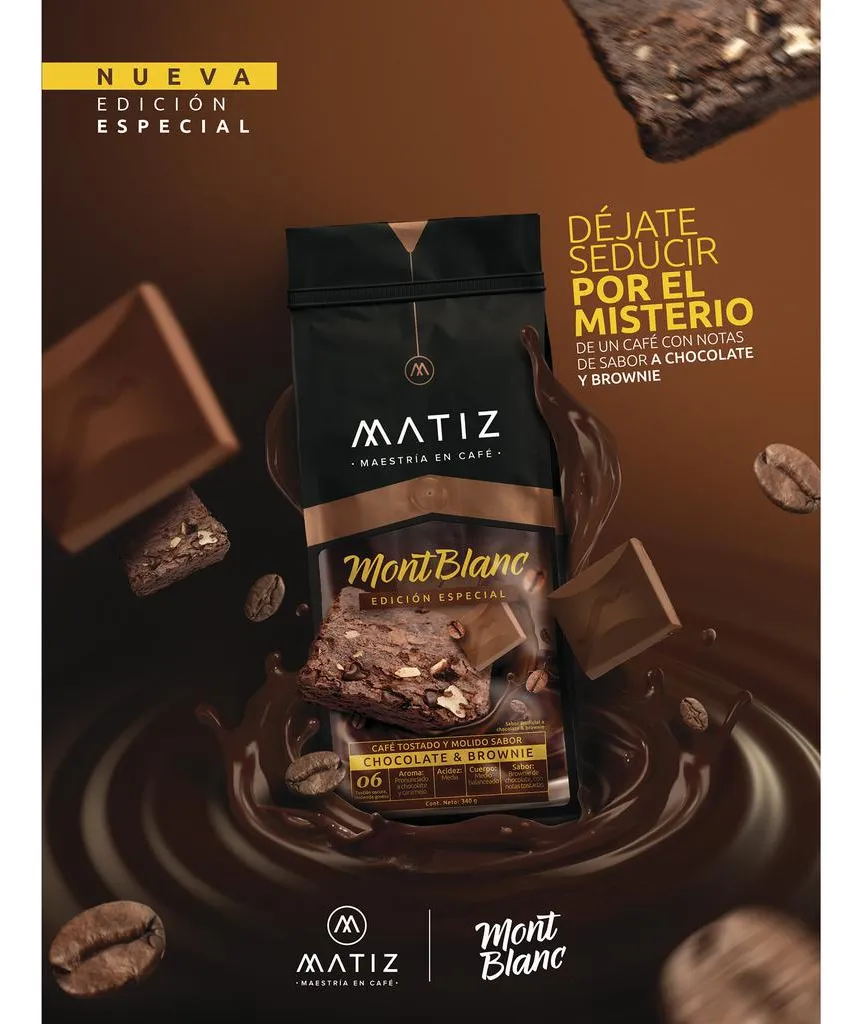 La edición especial de café Matiz Montblanc combina lo mejor de dos marcas Premium de Nutresa en una experiencia única de sabor. Este café tostado y molido, presentado en dos unidades de 340 gramos cada una, destaca por su delicioso sabor a brownie y chocolate, complementado con un aroma pronunciado a chocolate y caramelo, y un cuerpo balanceado.