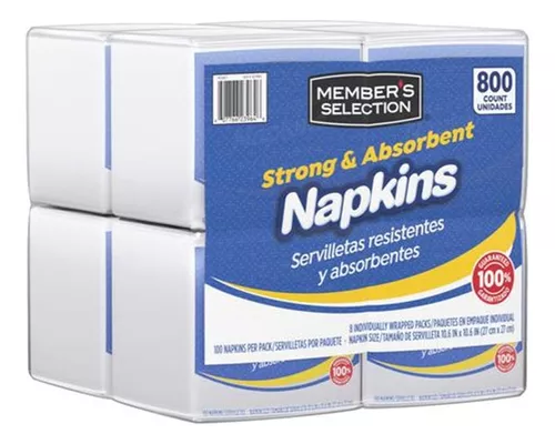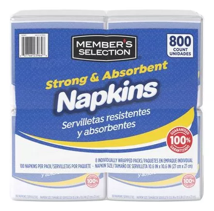 Nuestras servilletas Member’s Selection son las adecuadas para limpiar tus manos y cara mientras pruebas bocados de la comida que estes disfrutando en cualquier momento. Son resistentes y absorventes lo que las convierte en un elemento indispensable para ti y tu familia. Usalas siempre cuando las necesites.