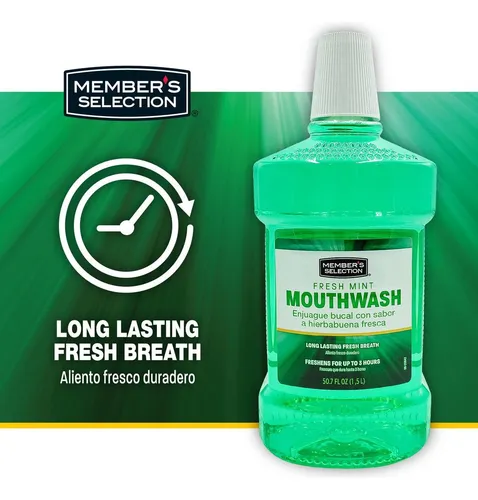 El enjuague bucal de menta fresca de la marca Member’s Selection ha sido formulado pensando en quienes buscan una sensación de limpieza profunda y duradera en cada enjuague. Con su fórmula avanzada, ayuda a combatir el mal aliento y contribuye a mantener la boca fresca durante horas, mientras sus ingredientes cuidan el equilibrio de la flora bucal, ayudando a prevenir la acumulación de bacterias y protegiendo las encías.