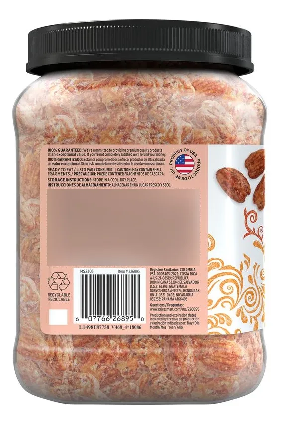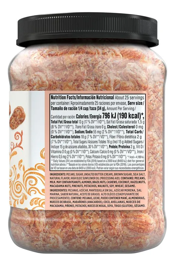 Contiene pacanas, leche. Puede contener maní, almendras, nueces de Brasil, marañones, coco, avellanas, nueces de macadamia, piñones, pistachos, nueces de nogal, soya y trigo | Listo para comer | Almacenar en un lugar fresco y seco | Producto de Estados Unidos.
