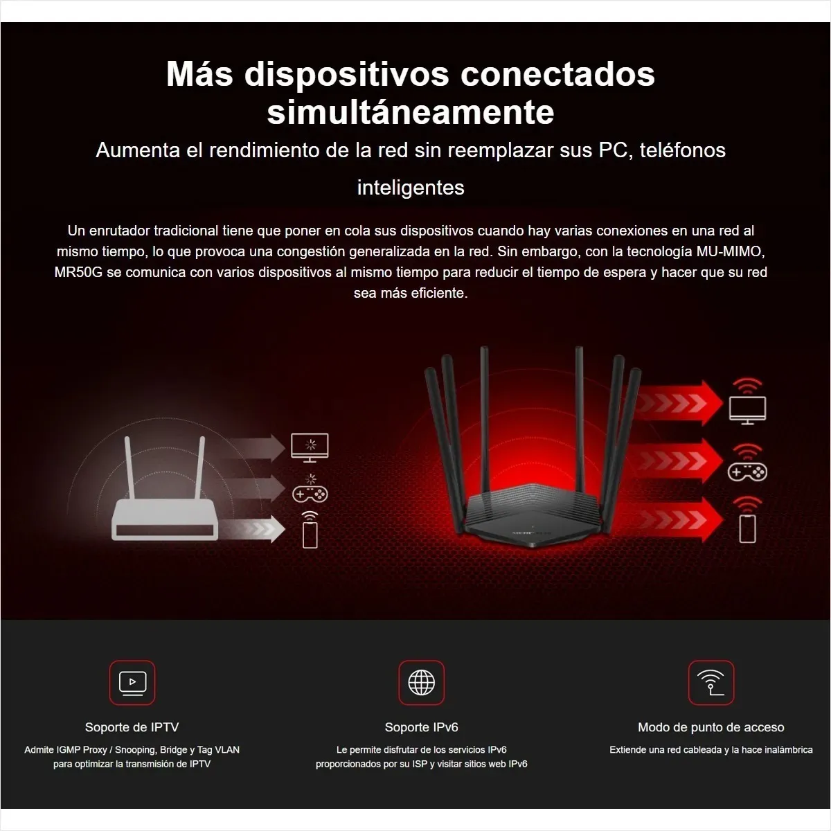 • Mayor eficiencia de la red : la tecnología MU-MIMO permite que MR50G se comunique con varios dispositivos al mismo tiempo, lo que aumenta el rendimiento general de la red.