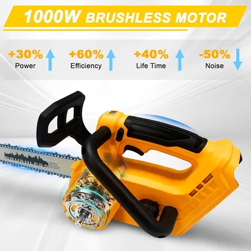 - Motor sin escobillas mejorado: la motosierra eléctrica inalámbrica tiene un motor sin escobillas, motor potente y engranajes profesionales. ¡Trabaja más rápido con menos ruido y vibración! lifesapan por más de 10 años. Adecuado para cortar árboles y madera en patios, jardines y granjas