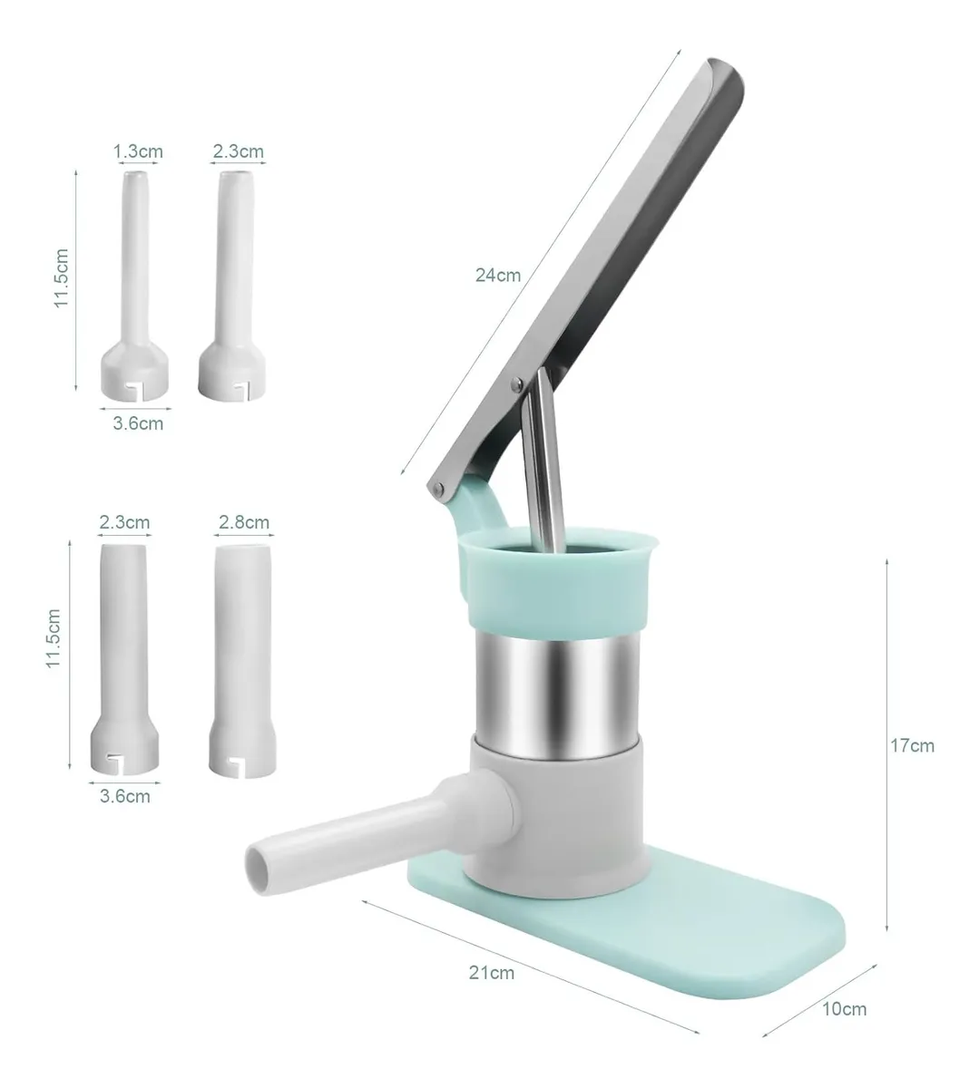 - Fácil de usar: utilizando el principio de levantar la barra, sin esfuerzo para presionar, más fácil de exprimir. Cuenta con un mango ergonómico y cómodo para un funcionamiento fácil y eficiente. Base más gruesa y más ancha, sin agitación cuando se usa, el diseño de base sólida garantiza que la máquina sea estable durante la fabricación de salchichas.