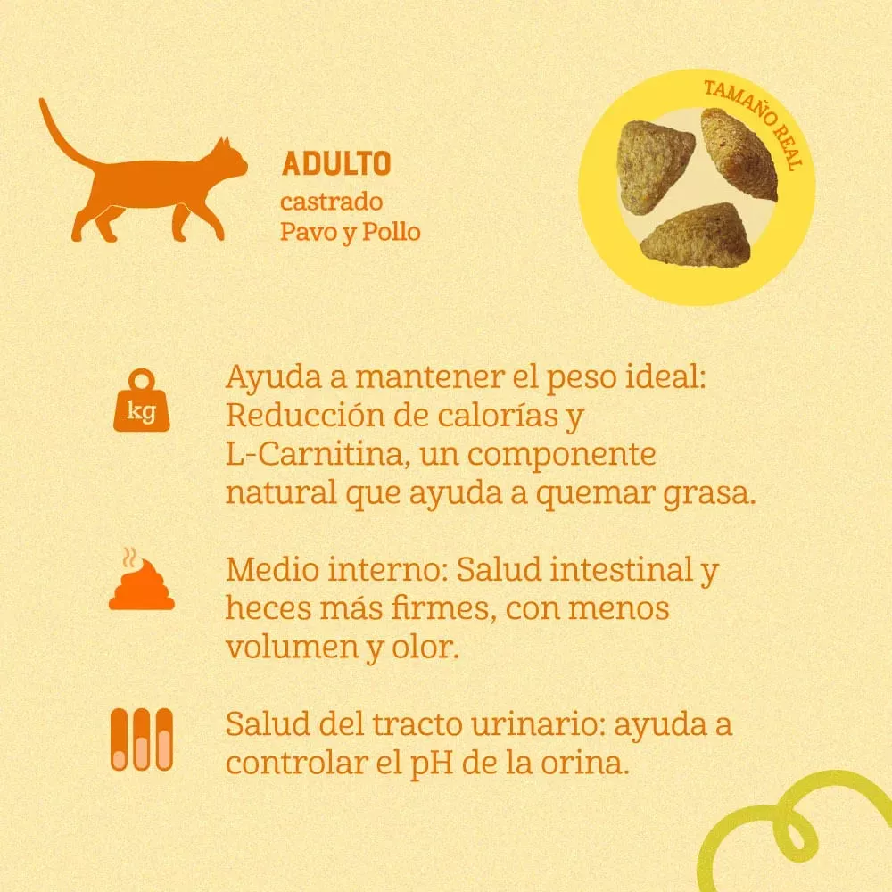 Con ingredientes de alta calidad, el pavo es la fuente principal de proteína, proporcionando la nutrición necesaria para mantener a tu gato activo y saludable. Este alimento está diseñado para satisfacer las necesidades específicas de los gatos castrados, ayudando a controlar su peso y promoviendo una vida más saludable.