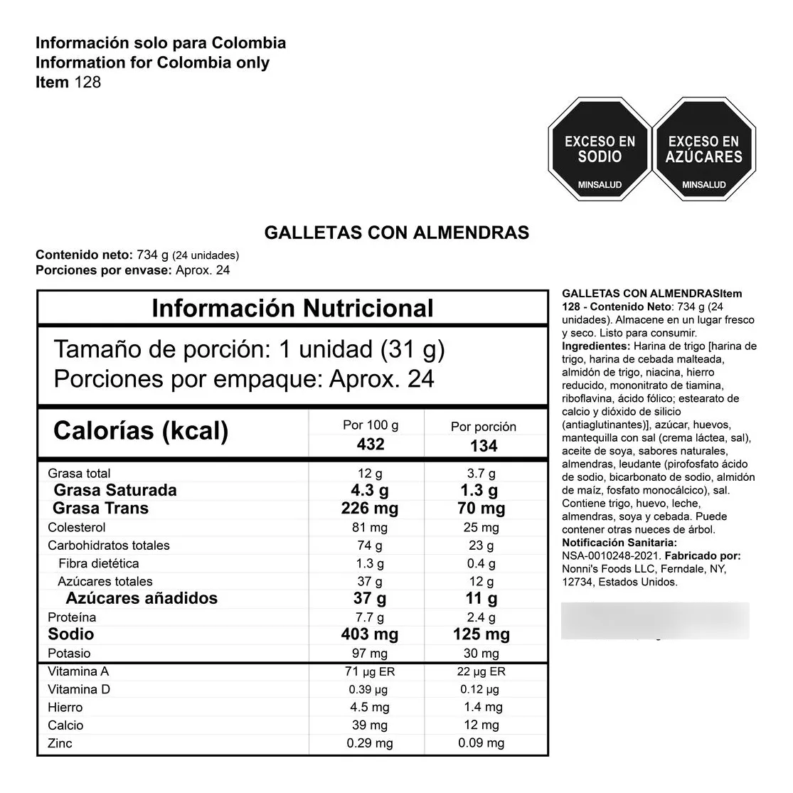 Harina de trigo [harina de trigo, harina de cebada malteada, almidón de trigo, niacina, hierro reducido, mononitrato de tiamina, riboflavina, ácido fólico; estearato de calcio y dióxido de silicio (antiaglutinantes)], azúcar, huevos, mantequilla con sal (crema láctea, sal), aceite de soya, sabores naturales, almendras, leudante (pirofosfato ácido de sodio, bicarbonato de sodio, almidón de maíz, fosfato monocálcico), sal.