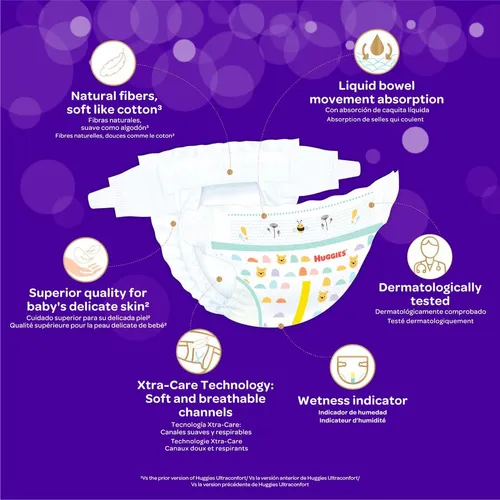 Brinda a tu bebé el cuidado más completo y confortable con los pañales Huggies UltraConfort, la elección perfecta para el día y la noche. Su suavidad y protección excepcionales en cada cambio de pañal se combinan con un encantador diseño de Winnie Pooh y la innovadora tecnología Xtra Care, que proporciona canales suaves y transpirables para una comodidad inigualable. Ahora, con el indicador de humedad incluido, nunca te perderás el momento adecuado para un cambio. Además, su extraordinaria capacidad de absorción y retención de líquidos evita fugas y escurrimientos, mientras que el sistema de cierre mecánico garantiza un ajuste perfecto y la tranquilidad de poder revisar a tu bebé en cualquier momento.