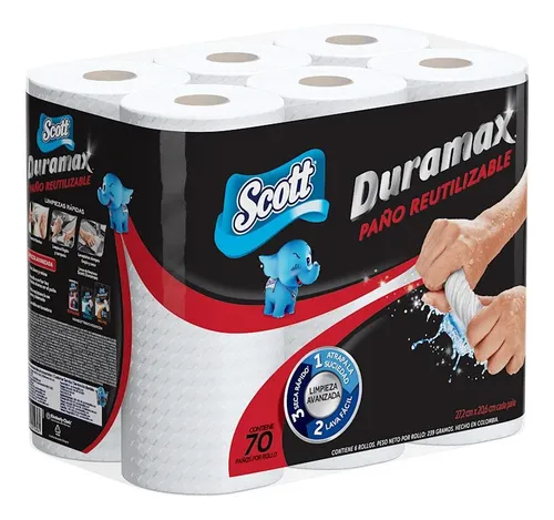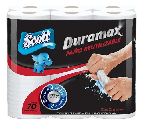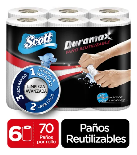 Los paños de cocina reutilizables Scott Duramax vienen en un paquete de 6 rollos, cada uno con 70 hojas diseñadas para soportar múltiples usos, con una durabilidad de hasta 4 veces por hoja. Fabricados con tecnología de hidrotela, no dejan pelusas y ofrecen una alta resistencia y absorción, siendo ideales para tareas de limpieza intensiva en el hogar. Para conservar su calidad, se recomienda almacenarlos en un lugar seco, limpio y fresco, manteniendo el empaque fuera del alcance de los niños.