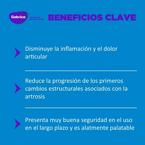 Beneficios 1. Disminuye la inflamación y el dolor articular. 2. Reduce la progresión de los primeros cambios estructurales asociados a la osteoartritis. 3. Se utiliza para el tratamiento del dolor perioperatorio asociado con cirugías ortopédicas y de tejidos blandos. 4. Muy buena seguridad en el uso en el largo plazo. 5. Comprimidos palatables.
